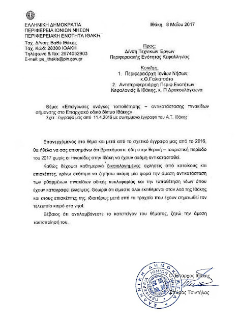 Σχετική αναφορά έστειλε και ο Διοικητής του Αστυνομικού τμήματος Ιθάκης, καθώς η ελλιπής σήμανση των