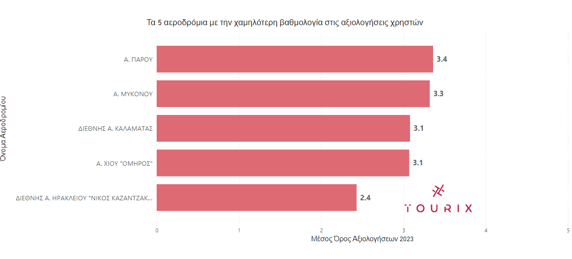 Στον αντίποδα, το αεροδρόμιο του Ηρακλείου συνεχίζει και το 2023 να είναι το αεροδρόμιο με τη χαμηλότερη βαθμολογία αξιολογήσεων στην Ελλάδα, με περαιτέρω μείωση στο μέσο όρο βαθμολογίας του σε σχέση με το 2022, λαμβάνοντας βαθμολογία αξιολόγησης 2.43 στα 5 (από 2.69 το 2022). Ακολουθούν τα αεροδρόμια της Χίου (3.07), της Καλαμάτας (3.08), της Μυκόνου (3.32) και της Πάρου (3.36).