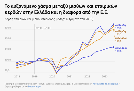 «α) Η Ελλάδα είχε το 2022 τη δεύτερη χαμηλότερη θέση στην Ε.Ε. στους μισθούς ως προς το ΑΕΠ, αλλά την τρίτη υψηλότερη ως προς τα εταιρικά κέρδη: «Tο 2022 τα εταιρικά κέρδη αυξήθηκαν 16% ενώ οι μισθοί 6%. Έτσι, η συμμετοχή των μισθών στο ΑΕΠ μειώθηκε 2,1 ποσοστιαίες μονάδες κι έπεσε στο 27% (δεύτερο μικρότερο ποσοστό στους 27 της ΕΕ) ενώ η συμμετοχή των κερδών στο ΑΕΠ αυξήθηκε 1,8 ποσοστιαίες μονάδες κι ανέβηκε στο 52,2% (που είναι το τρίτο μεγαλύτερο ποσοστό στους 27 της ΕΕ και το δεύτερο μεγαλύτερο στους 20 της Ευρωζώνης). Το ίδιο έτος, 2022, ο μέσος μισθός στη χώρα μας ήταν στην 24η θέση μεταξύ των 27 της ΕΕ και στην τελευταία θέση μεταξύ των 20 της Ευρωζώνης. Οι αποκλίνουσες πορείες μισθών – κερδών επιτάθηκαν το επόμενο έτος, 2023». (Kreport, 28/2/2024)