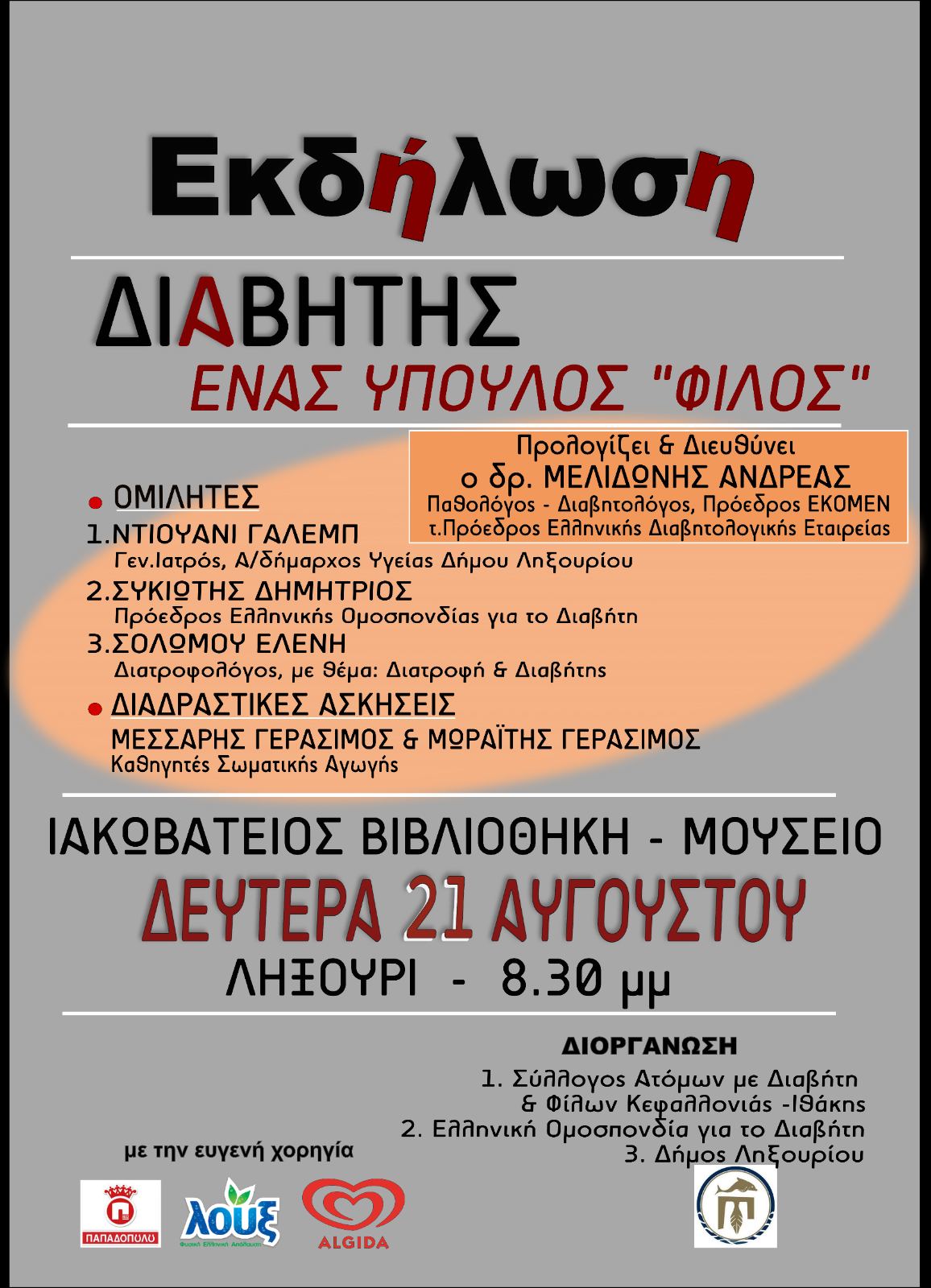 «Την εκδήλωση την διοργανώνει ο νεοϊδρυθείς Σύλλογος Ατόμων με Διαβήτη Κεφαλονιάς και θα είναι μία εκδήλωση για τον Διαβήτη και την σύγχρονη διατροφή και άσκηση, που συμβάλλουν πάρα πολύ στην αντιμετώπιση του Διαβήτη.