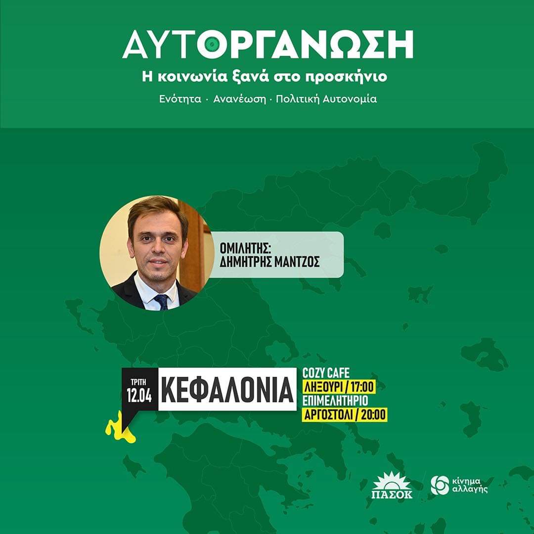Στην Κεφαλονιά αύριο (12/4), θα βρίσκεται κοντά μας ο Δημήτρης Μάντζος, Εκπρόσωπος Τύπου του ΠΑ.ΣΟ.Κ. – ΚΙΝ.ΑΛ. ως κεντρικός ομιλητής σε 2 εκδηλώσεις για την Αυτοοργάνωση: