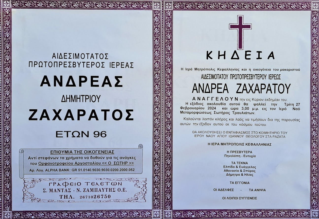 Εκοιμήθη Ενας παπάς του Λαού. Εχθές Κυριακή, ο Πρωτοπρεσβύτερος παπα Ανδρέας Ζαχαράτος του Δημητρίου άφησε την τελευταία του πνοή , πλήρης ημερών και εμπειριών και πλέον βρίσκεται στο Υπερουράνιο Θυσιαστήριο και συλλειτουργεί με πολλούς φίλους ιερείς και Αρχιερείς καθώς και του αγαπημένου του (μας ) Δεσπότη, του Μακαριστού Γεράσιμου Φωκά. Ενας παπάς που γνώρισε το κυνήγι του Ναζί κατακτητή, του όρθωσε ανάστημα , κυνηγήθηκε κι από δοσίλογους και ”δεν μάσησε” και τέλος ενδύθηκε και το ένδυμα της Ιερωσύνης , σε ωριμη ηλικία και έχοντας την ευλογημένη του οικογένεια παντοτινό στήριγμα. Εγινε ιερέας του Υψίστου γνωρίζοντας ότι έχοντας απογοητευθεί από την δικαιοσύνη των ανθρώπων. ποτέ δεν θα τον απογοήτευε η δικαιοσύνη του Θεού, κι αφού πάντα αγωνιζόταν για ”ενί τούτων των αδελφών μου των ελαχίστων” η πράξη αυτή θα ήταν πραγματικά ”Θεάρεστη” . Και υπηρέτησε πολλά χρόνια , με σύνεση και πυγμή , και δεν έκρυβε την αντιπάθειά του για τον Φαρισαϊσμό και την υποκρισία όπου κι αν την συναντούσε. Ηταν αυθεντικός αλλά και η Θεία Χάρης της Ιερωσύνης μαζί με τις εμπειρίες που αποκόμησε από τις τρικυμίες που αντιμετώπισε στην βιωτή του του έδωσαν μια Σοφία που μάγευε. Είχα την τύχη και την ευλογία να βρεθώ ιδιαίτερα κοντά του από τις πρώτες μέρες της δικής μου Ιερωσύνης, και να γνωρίσω το λεβέντικο ανάστημα αυτού του , θα τολμούσα να πώ , μικροκαμωμένου παπά. Μάθημα ζωής ότι εκεί που σταματάει το ύψος , αρχίζει το ανάστημα . Να έχουμε την ευχή και την μεσιτεία του . Αύριο Τρίτη 27/2 η οικογένεια θα τον συνοδεύσει στην εκκλησία που για τόσα χρόνια διακόνησε, στον Σωτήρα Τραυλιάτων από τις πρωινές ωρες και θα διαβάζονται Ευαγγελικές Περικοπές υπο των ιερέων μέχρι την έναρξη της εξοδίου ακολουθίας που θα γίνει ωρα 3 μ.μ.. Τα πιο θερμά συλλυπητήρια στην ευλογημένη του οικογένεια Αναφέρει με αναρτησή του ο ιερέας π. Ξενοφών Ζαρκάδας