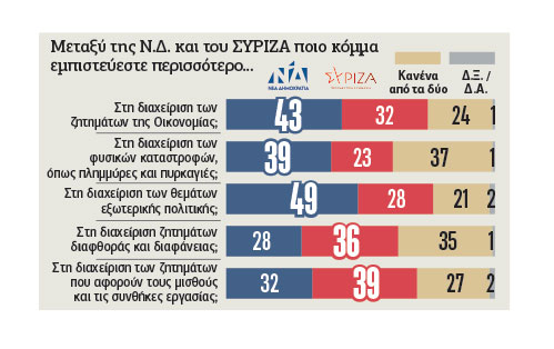 Αντίστοιχα, ο Κυριάκος Μητσοτάκης προσλαμβάνεται ως αποτελεσματικότερος, συνεπέστερος αλλά και ικανότερος στη διαχείριση των οικονομικών.