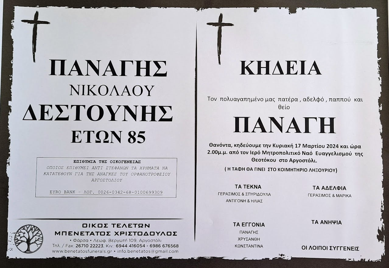 Εφυγε σήμερα ο Ιδρυτής της Ιχθυόσκαλας Κεφαλλήνιας ο αγαπητος μας Παναγής Δεστούνης αφήνοντας μια παρακαταθήκη και συνέχεια της επιχειρήσεις του στον Γιο του Μάκη και μαζί και η Τρίτη Γενιά που θα συνεχιση ο Εγγονός του Παναγής Δεστούνης