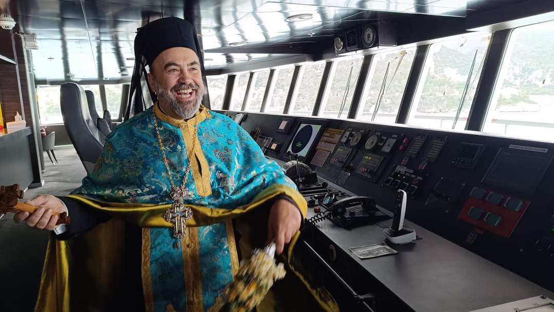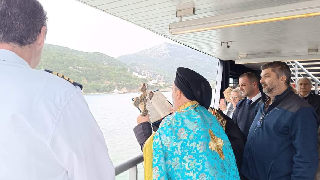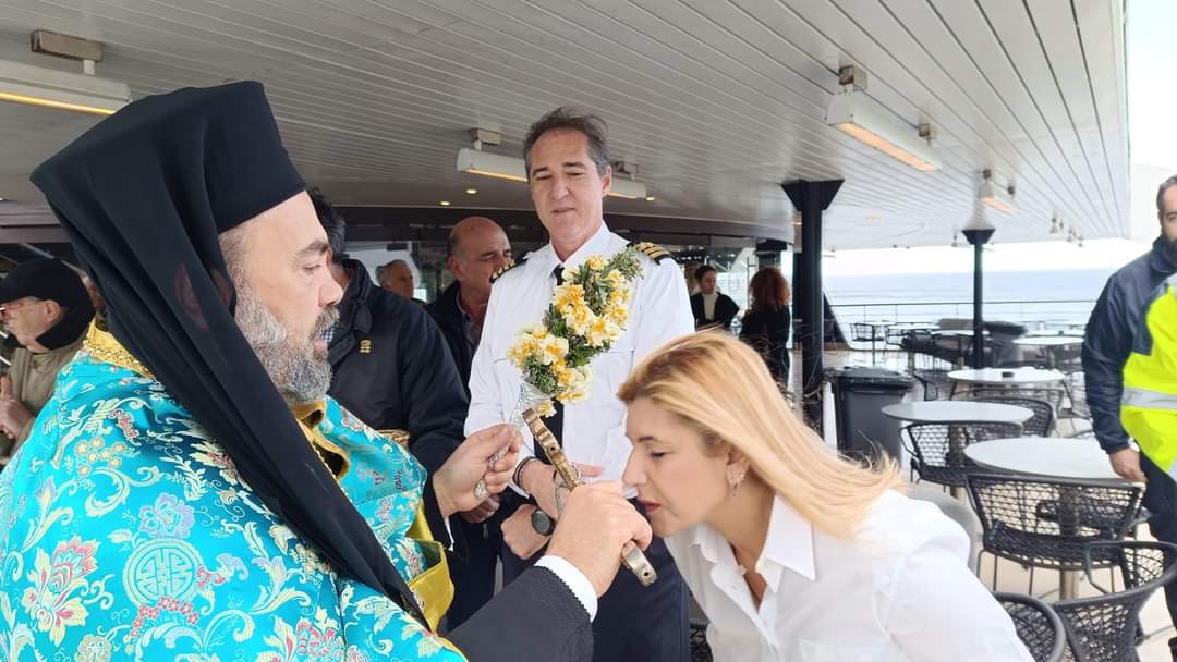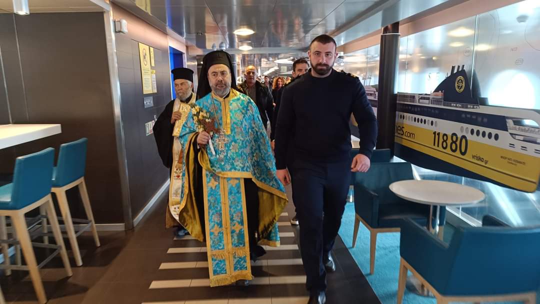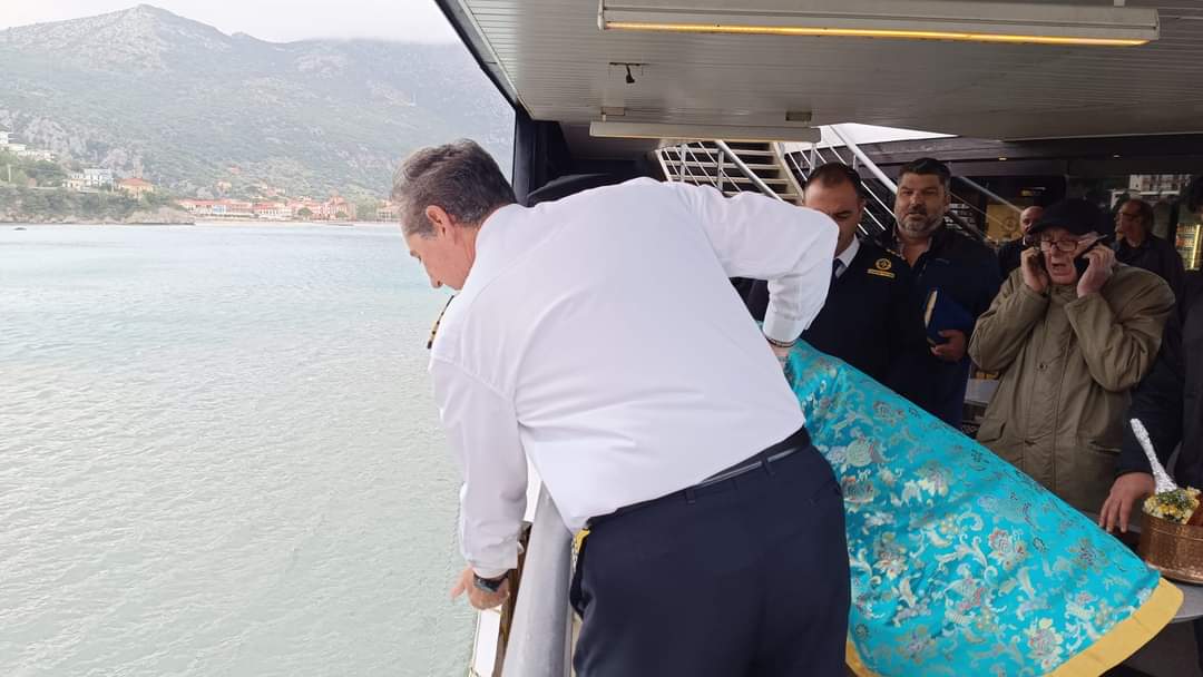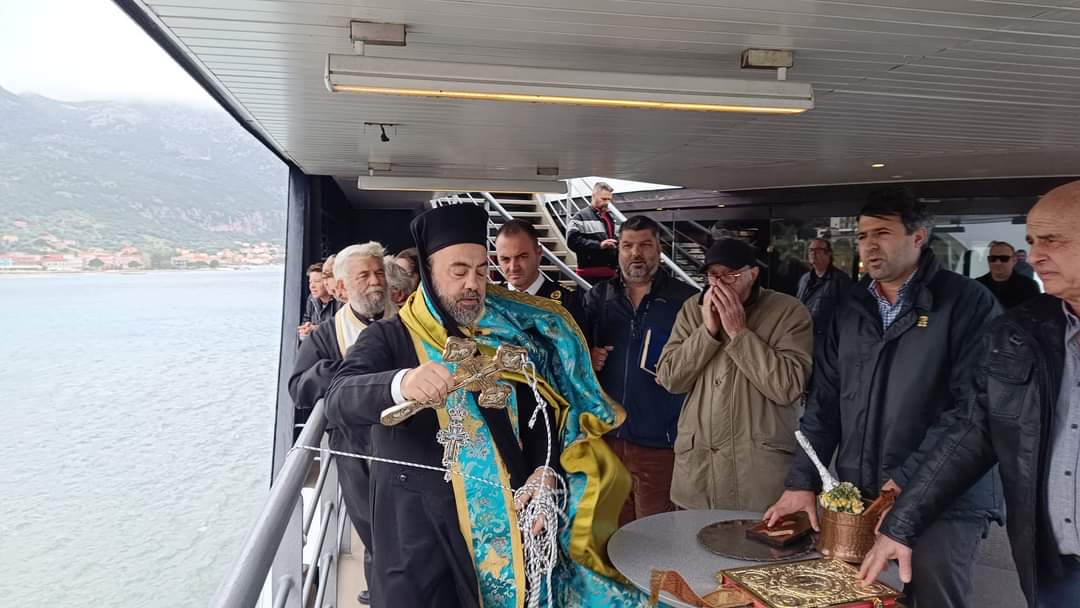Τέλος, οι Ιερείς και οι πιστοί πήγαν στο Φέρι Μποτ Fior Di Levante του φιλόξενου Καπετάνιου Νίκου Γρηγορόπουλου όπου έγινε ο Αγιασμός του καραβιού και η ευλογία του πληρώματος. Πραγματοποιήθηκε η ρίψη του Σταυρού από το πλοίο στη θάλασσα από τους δύο Ιερείς, από τον Καπετάνιο και μέλη του πληρώματος του πλοίου.