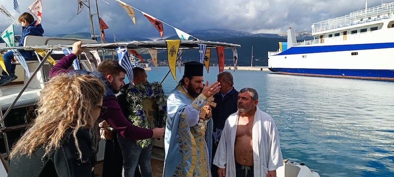 Στο χώρο μπροστά από το Λιμεναρχείο, οι πιστοί από όλη τη Δημοτική Ενότητα Σάμης, παρακολούθησαν την τελετή στην οποία χοροστάτησε ο εφημέριος της πόλης Πατέρας Κωνσταντίνος Ζαπάντης, που όπως πάντα έριξε το σταυρό από πλοιάριο!