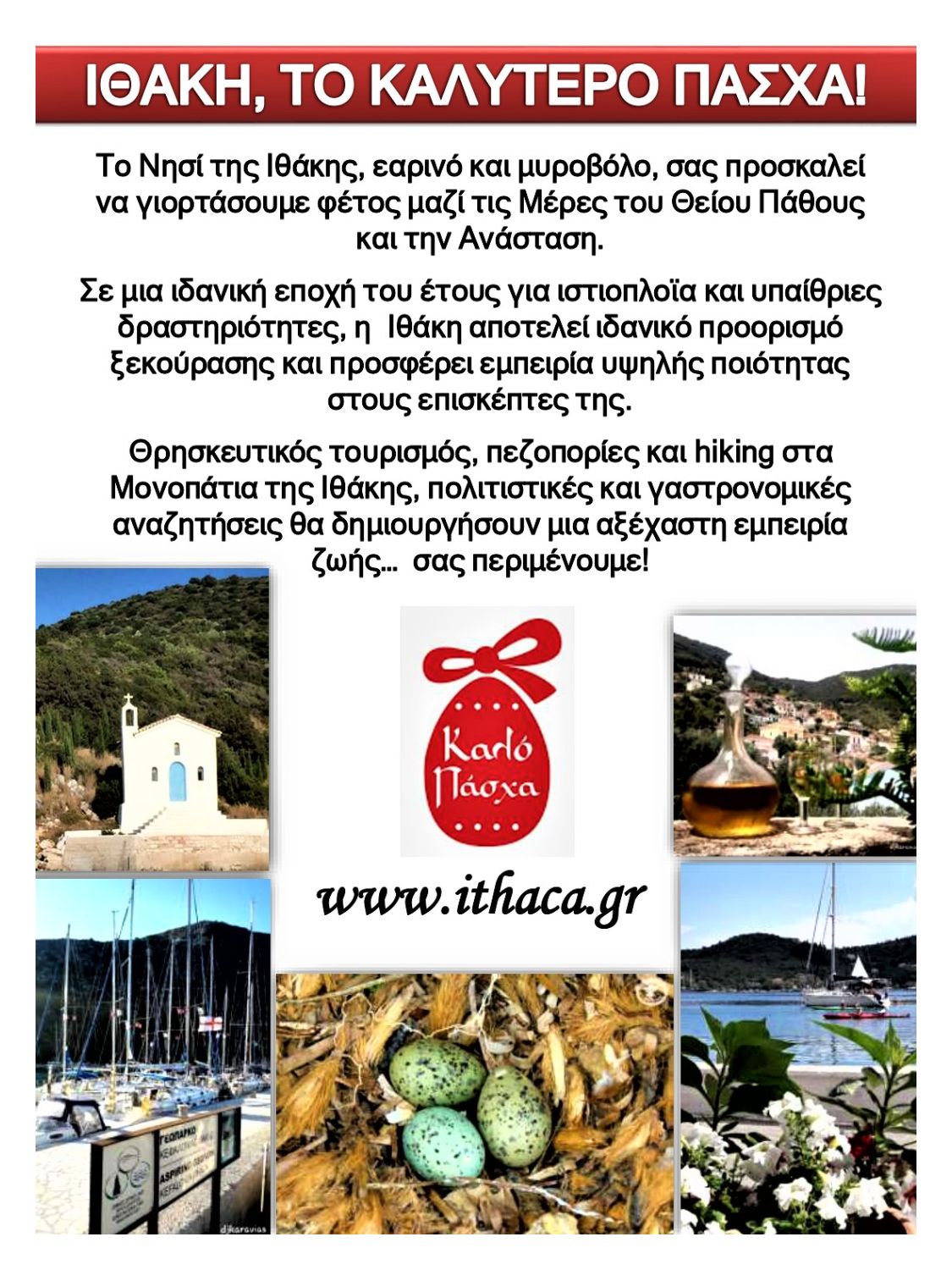 «Το Νησί της Ιθάκης, εαρινό και μυροβόλο, σας προσκαλεί να γιορτάσουμε φέτος μαζί τις Μέρες του Θείου Πάθους και την Ανάσταση.