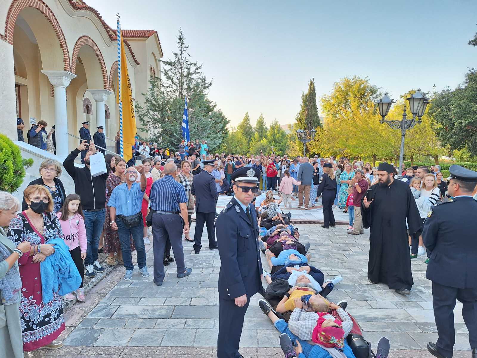 Πολλοί δε ήταν οι πιστοί, οι οποίοι παραδοσιακά ξάπλωσαν, στην πλακόστρωση του εξωτερικού χώρου της εκκλησίας, έτσι ώστε να περάσει από πάνω τους το Σκήνωμα, που σήκωσαν τα μέλη του Πολιτιστικού Συλλόγου Βαλσαμάτων “Ο Βάλσαμος”.