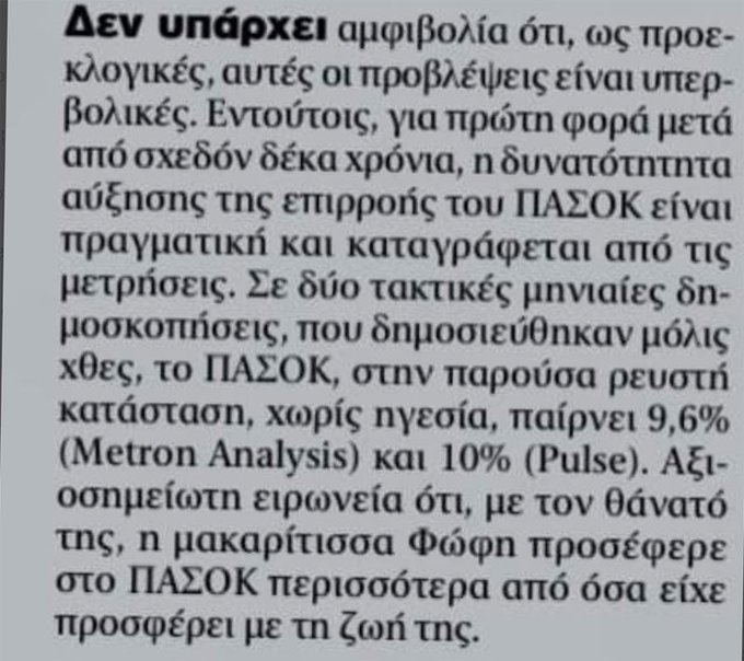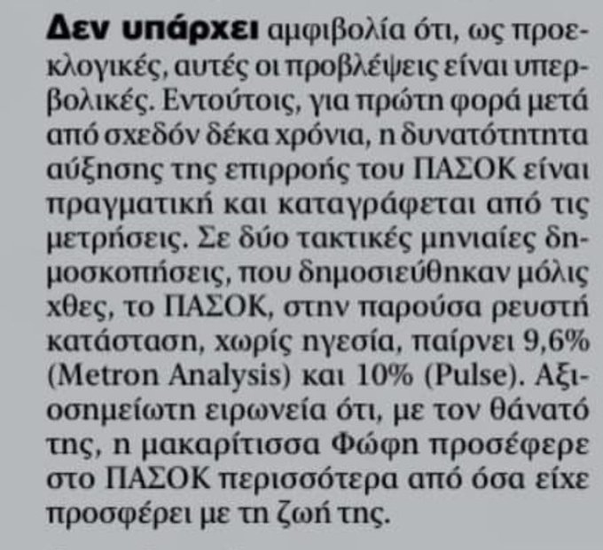 Αξιοσημείωτη ειρωνεία ότι με τον θάνατο της η μακαρίτισσα Φώφη προσέφερε στο ΠΑΣΟΚ περισσότερα από όσα είχε προσφέρει με τη ζωή της»