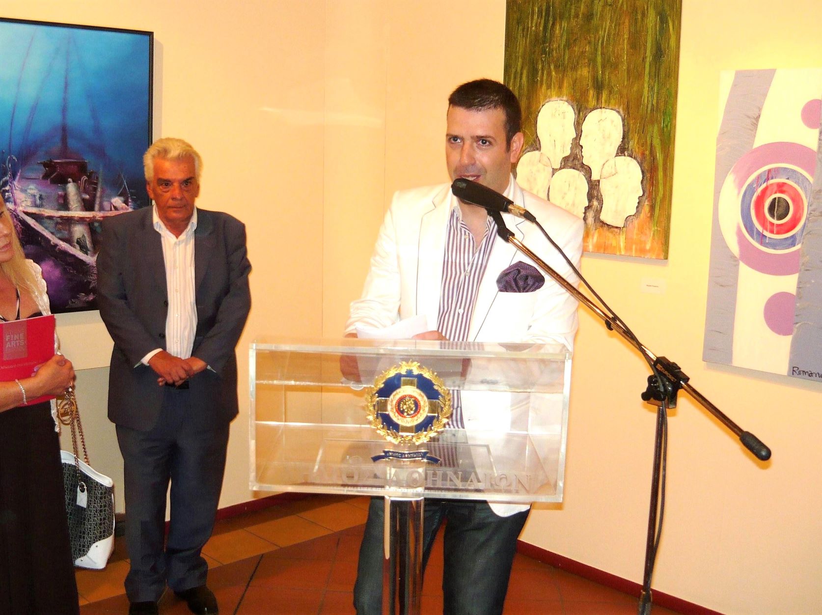 “…Ο Πολιτισμικός Οργανισμός του Δήμου Αθηναίων και ο Δήμαρχος Αθηναίων κ. Νικήτας Κακλαμάνης πιστεύουν ότι νέες ιδέες από νέους ανθρώπους συμβάλλουν στη συνέχιση και εξέλιξη της τέχνης. Η τέχνη, όπως όλοι οι τομείς της ζωής, πρέπει να ανανεώνονται. Με αυτές τις σκέψεις οργανώνουμε την έκθεση “Ελληνικά χρώματα – Ειρηνικά χρώματα” με τον διακεκριμένο επιμελητή εκθέσεων και εξαιρετικό καλλιτέχνη Μιχαήλ Ρωμανό, για να δώσουμε τη δυνατότητα σε νέους δημιουργούς να προβάλουν το έργο τους αλλά και στους πολίτες να πάρουν τα νέα μηνύματα…” είχε τονίσει μεταξύ άλλων ο Άγγελος Μοσχονάς στα εγκαίνια και σε κείμενο στους καταλόγους που συνόδευαν τις εκθέσεις (21-9-2009).