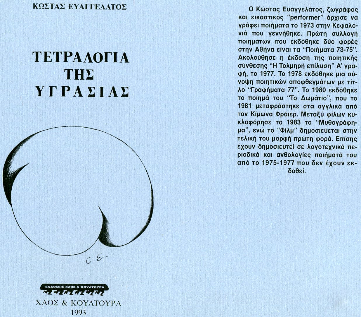 Αυτό το οποίο θαυμάζω στον Κώστα Ευαγγελάτο, πέρα από το εικαστικό του ταλέντο, είναι η εργατικότητά του. Θυμάμαι λ.χ. την έκθεσή του με τον τίτλο «Scriptorium II» που διοργανώθηκε από τον Πολιτιστικό Οργανισμό του Δήμου Αθηναίων τον Οκτώβριο του 2010. Είχα εντυπωσιαστεί από το πλήθος των θεμάτων με τα οποία είχε ασχοληθεί, αλλά και με τη συνεχή αναζήτηση των τεχνικών και της φόρμας των έργων του. Κυρίαρχο στοιχείο τους η ανθρώπινη μορφή περιτριγυρισμένη ή περικλειόμενη ή αποδεσμευόμενη από στοιχεία του ρεαλιστικού ή του ιδεατού περιβάλλοντος, μορφές που ο ίδιος αποκαλεί εννοιακές. Τόσο έργο σε ποσότητα που διατηρεί και προσωπικό ύφος και βρίσκεται σε υψηλό επίπεδο προϋποθέτει αναμφισβήτητα πολλή δουλειά. Αλλά δεν είναι μόνο αυτό η ένδειξη της εργατικότητας του Κώστα Ευαγγελάτου. Ο μόχθος του αποτυπώνεται και σε μια σειρά λευκώματα που έχουν κυκλοφορήσει από εκδότες ή οργανισμούς, ακόμα και από ημερολόγια που η υψηλή στάθμη τους αποτελεί μέσο αισθητικής αγωγής. Άφησα τελευταίο το συγγραφικό του έργο που απαρτίζεται από ένα βιβλίο με δοκίμια (1997) και από ποιητικές συλλογές με ποιήματα γραμμένα από το 1973 έως το 1999. Ακολούθησε η συγκεντρωτική έκδοση «Αλέα Προσομοίων» που κυκλοφόρησε το 2002, με τους καρπούς δηλαδή μιας τριακονταετίας. Η χρονική αυτή διάρκεια δείχνει ότι το ενδιαφέρον του Κ.Ε. για την ποίηση δεν ήταν ευκαιριακό, αλλά διαρκές και ουσιαστικό, ένας ακόμα τρόπος βιωματικής έκφρασης όπως και η ζωγραφική του. Τη συγκεντρωτική αυτή έκδοση ακολούθησε το ποιητικό του βιβλίο, «Η ελεγεία των Εκβατάνων» που, όπως γράφει ο Δρ. Ηλίας Τουμασάτος, καλύπτει «το ταξίδι του από την ταπεινή οδό Εκβατάνων στου Ζωγράφου, όπου ζούσε ως φοιτητής, στη θρυλική πρωτεύουσα των Περσών, κι από κει στη δική μας ψηφιακή εποχή, την εποχή της υψηλής τεχνολογίας και της συγκαλυμμένης θηριωδίας». Το 2011 κυκλοφόρησε το ποιητικό βιβλίο του με τον τίτλο «Εγκάρσια πτήση» εκδόσεις Απόπειρα. Όπως έλεγε και ο αρχαίος κυνικός φιλόσοφος Αντισθένης «αρχή σοφίας η των ονομάτων επίσκεψις».