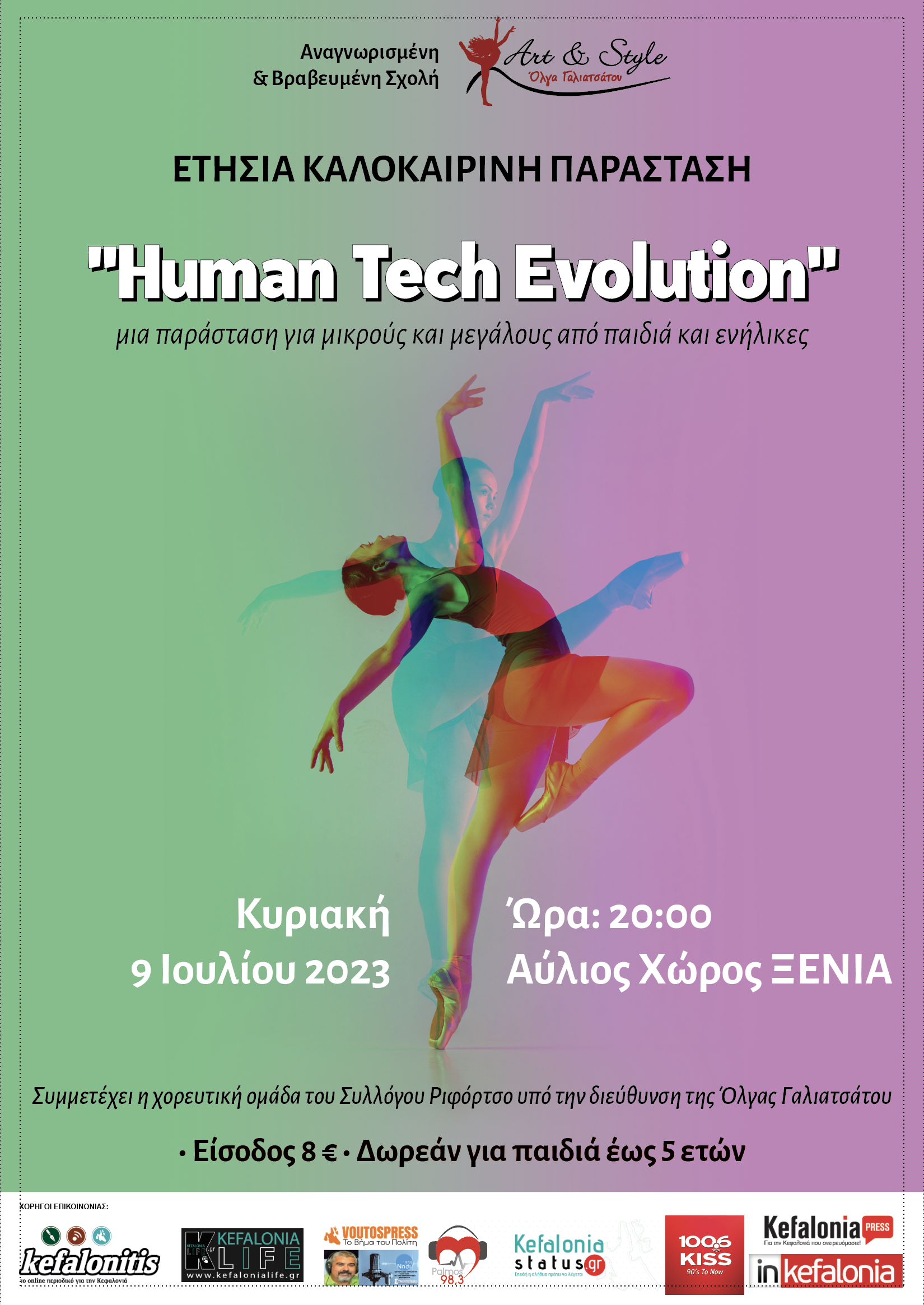 Αυτή την Κυριακή 9 Ιουλίου πρόκειται να πραγματοποιηθεί η Μεγάλη Χορευτική Παράσταση του καλοκαιριού ‘Human Tech Evolution’ της αναγνωρισμένης και βραβευμένης Σχολής χορού ‘Art & Style’ Dance School Olga Galiatsatou.
