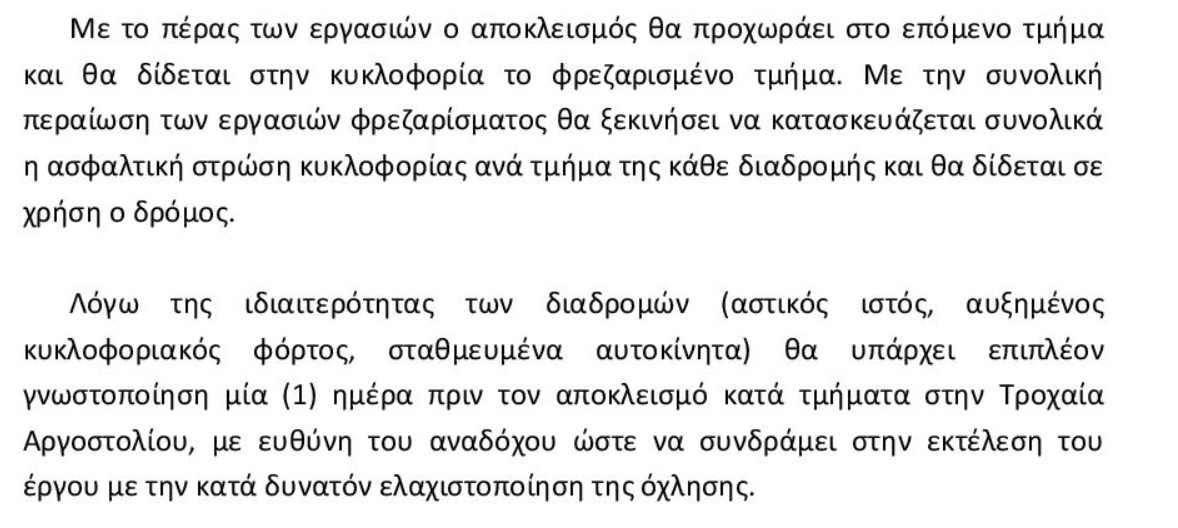 Σύμφωνα με την απόφαση του Δημοτικού Συμβουλίου, για την εκτέλεση των εργασιών θα γίνεται πλήρης αποκλεισμός της κάθε οδού κατά τμήματα, ώστε να φρεζάρεται, να διαβρέχεται όλο το διατιθέμενο πλάτος ασφαλτικού οδοστρώματος στο αποκλεισμένο τμήμα.