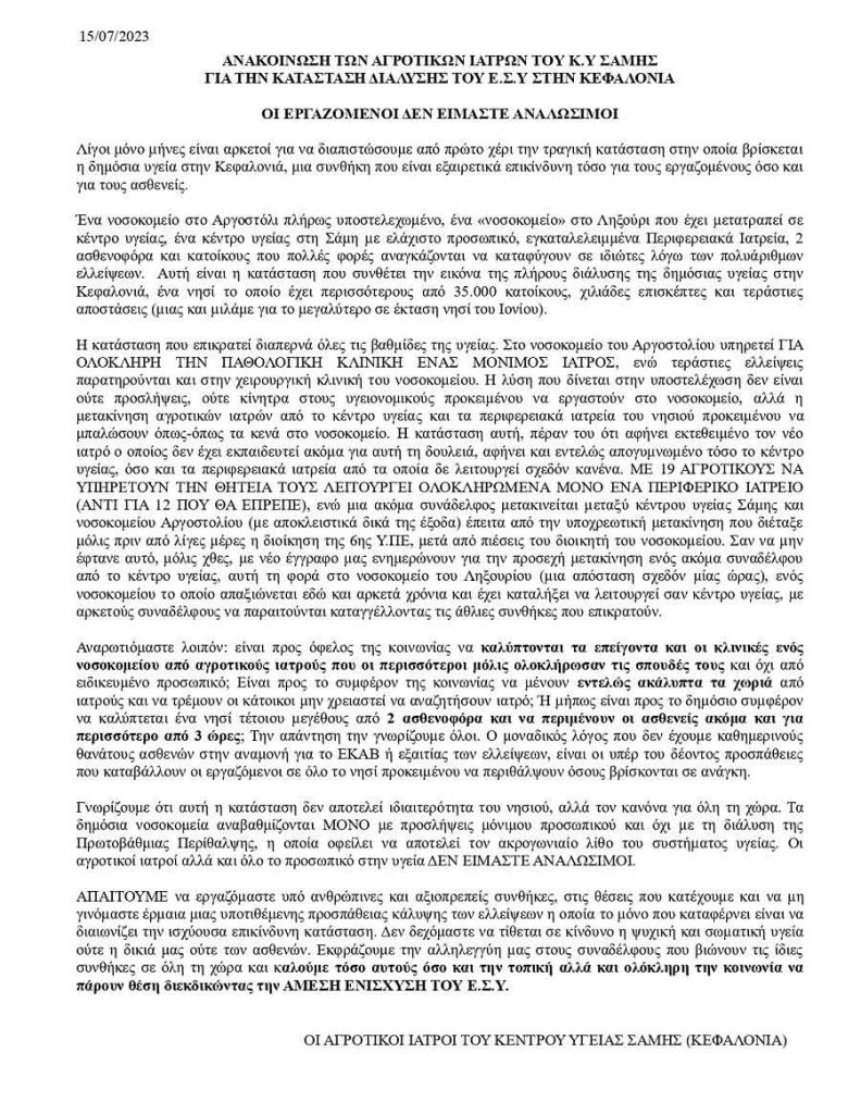 Σε πλήρη Αδιαφορία η Υγεία μας στην Κεφαλονιά και Ιθακη κραυγή διαμαρτυρίας και αγωνίας από τους Αγροτικούς ιατρούς του Κέντρου Υγείας Σάμης και Όχι Μόνο !!!