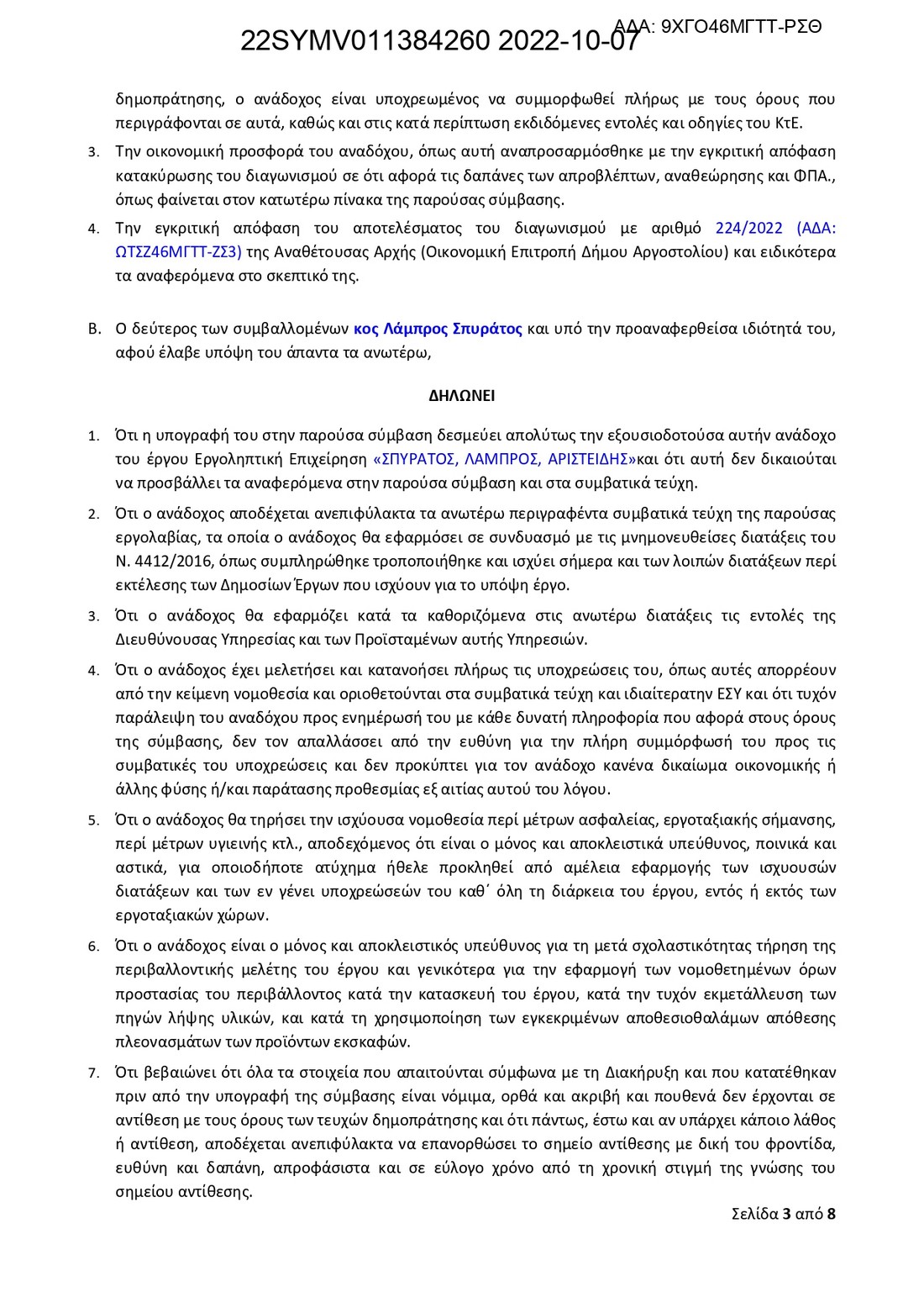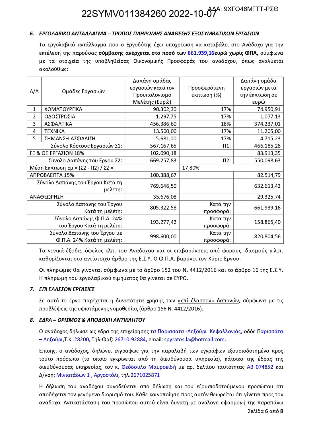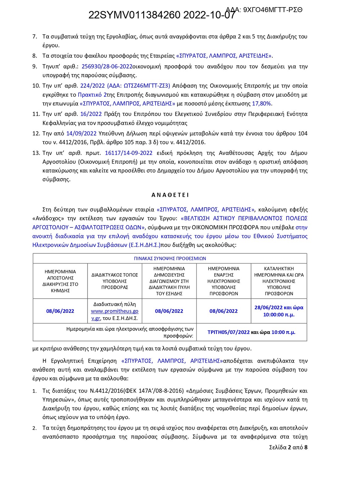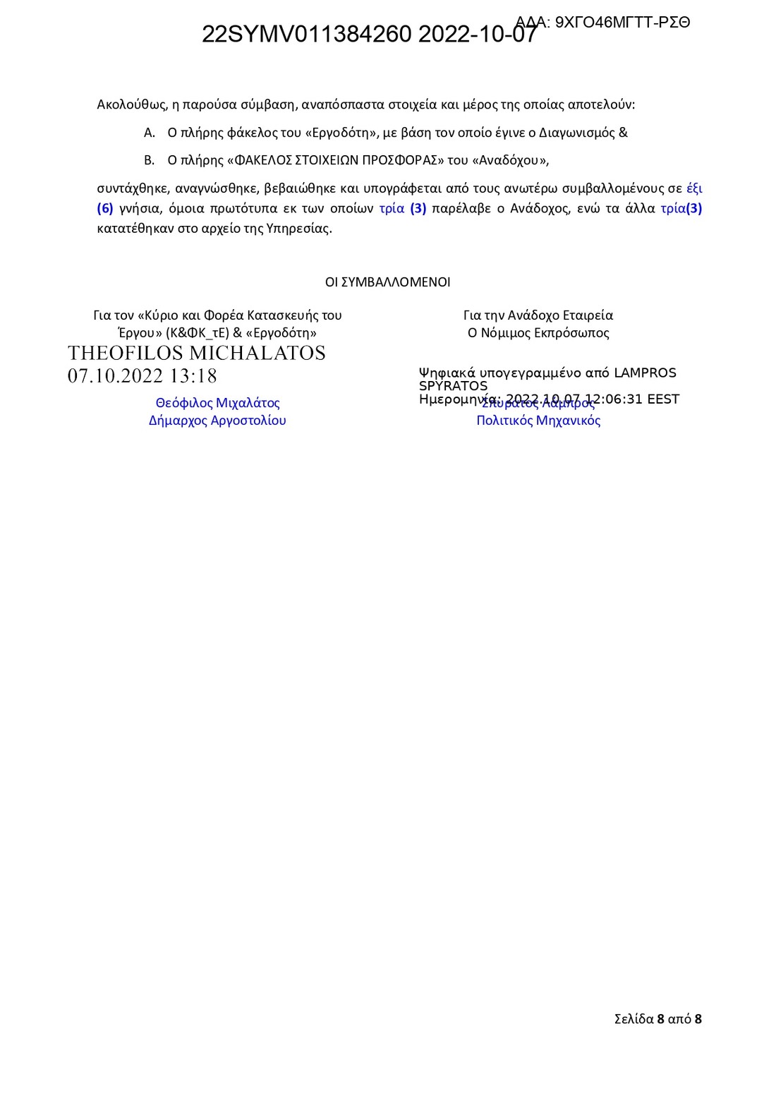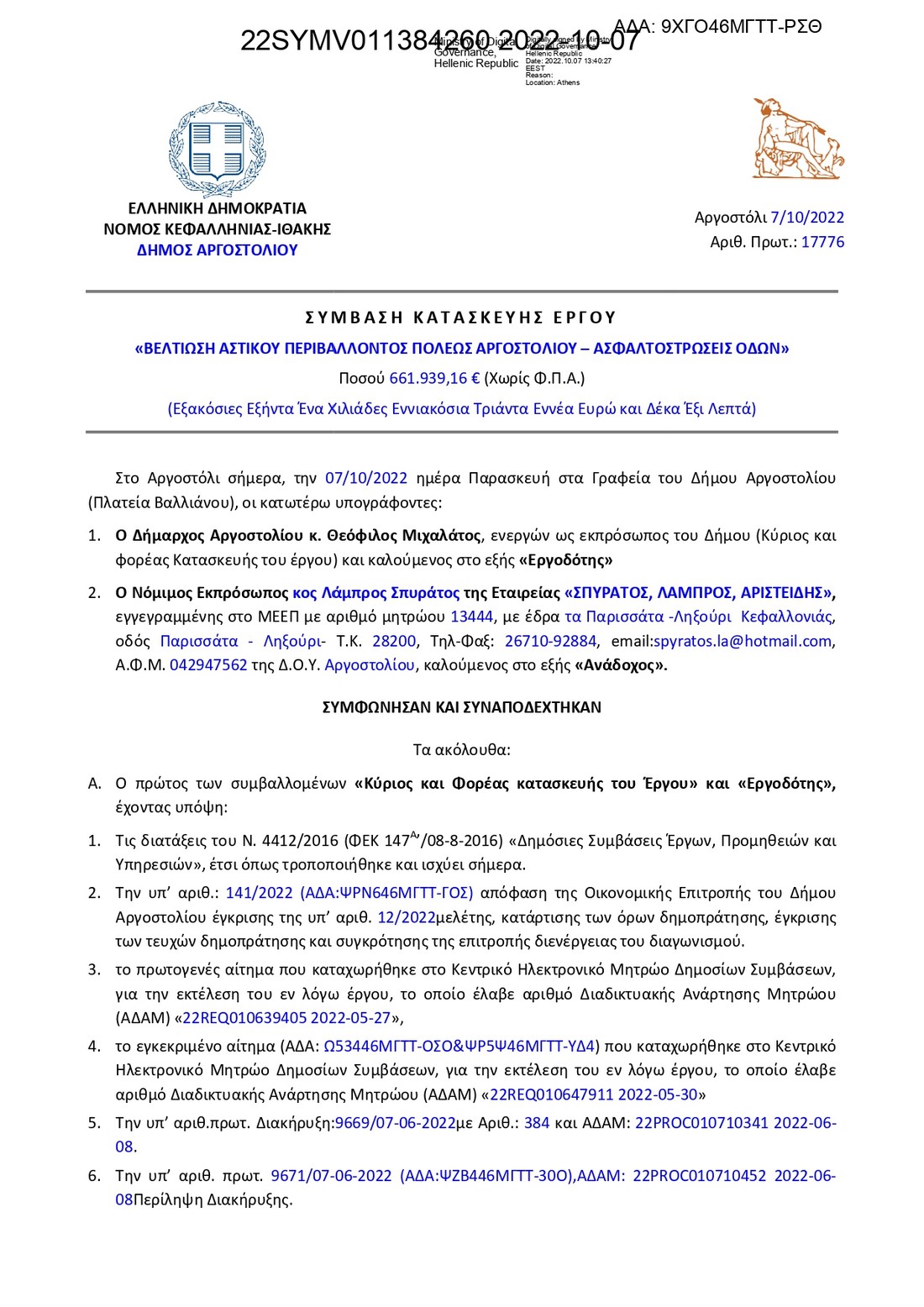 Σημαντική μέρα σήμερα, καθώς υπογράφηκε η σύμβαση μεταξύ του Δημάρχου Αργοστολίου Θεόφιλου Μιχαλάτου και της αναδόχου εταιρίας για το μεγάλο έργο “Βελτίωση αστικού περιβάλλοντος πόλεως Αργοστολίου – Ασφαλτοστρώσεις Οδών” στο Αργοστόλι.