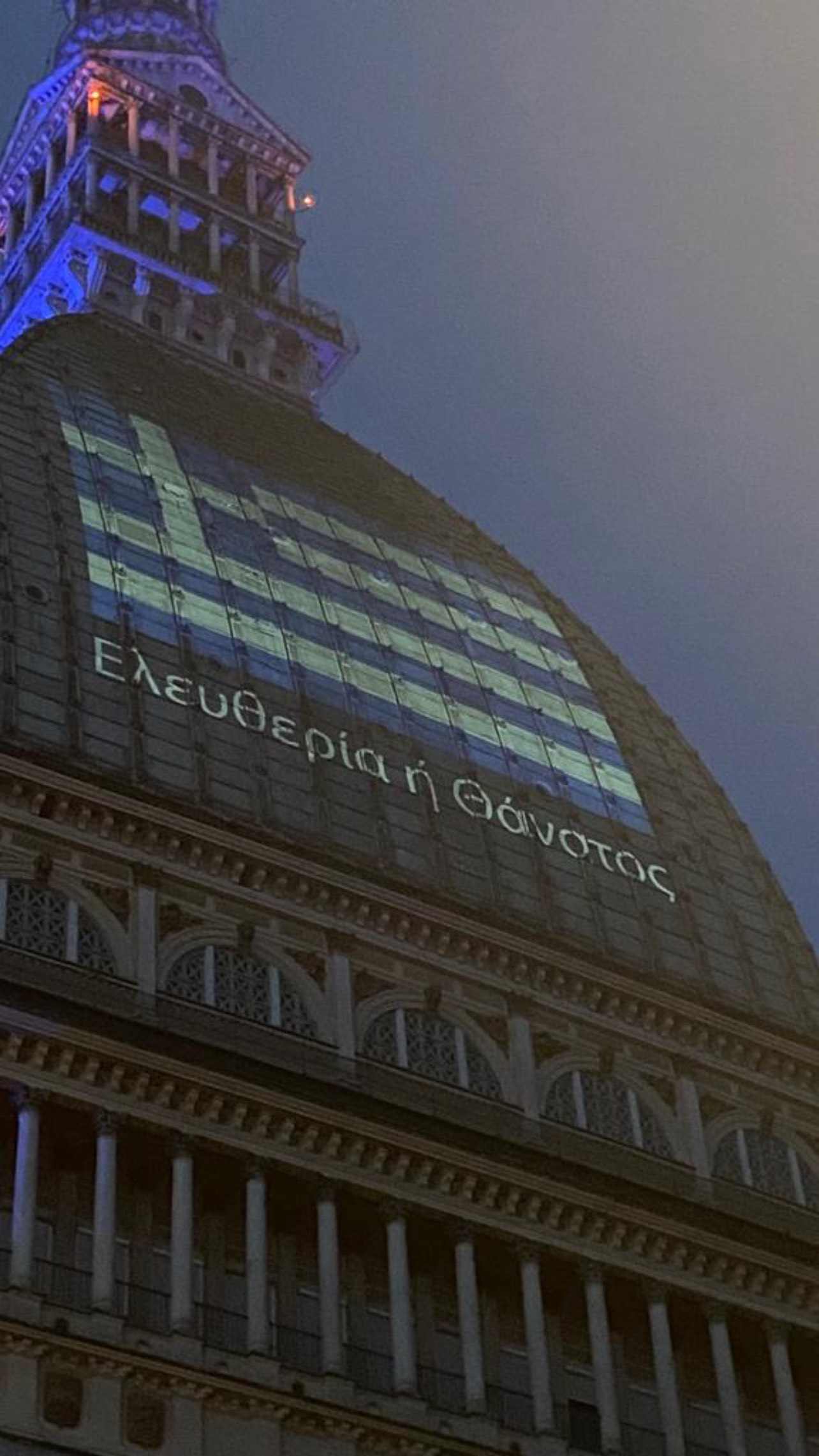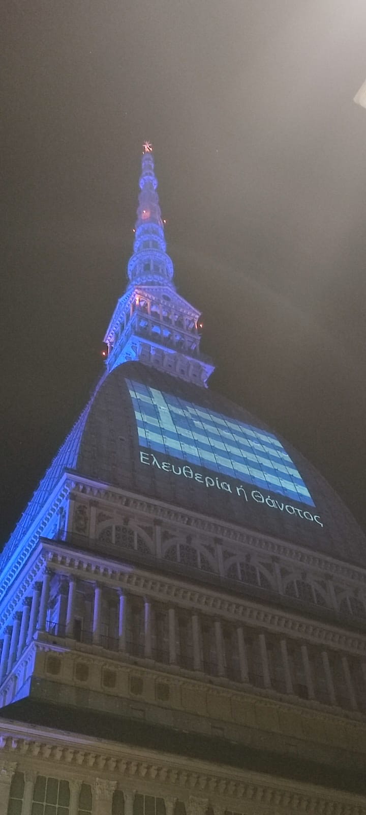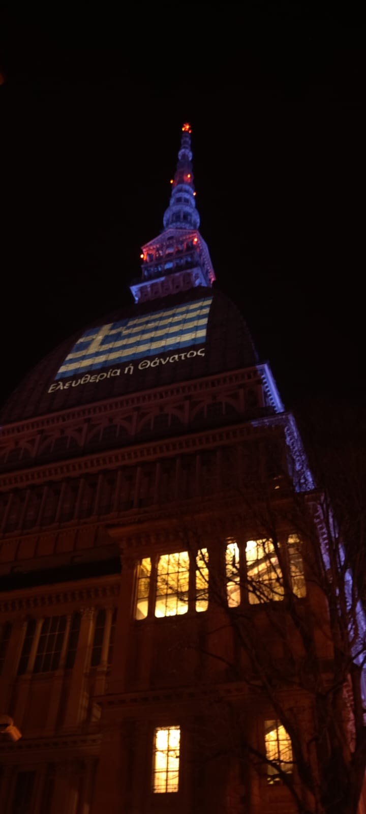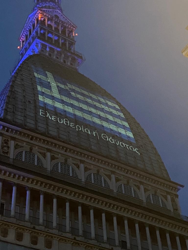 Η πόλη του Τορίνο θύμισε… Ελλάδα το βράδυ της 25ης Μαρτίου, καθώς το κτήριο – ορόσημο της πόλης, η Μόλε Αντονελιάνα, ύψους 166 μέτρων, προέβαλε στην επιβλητική της θόλο την ελληνική σημαία, και το σύνθημα «Ελευθερία ή θάνατος». Το κτήριο που χτίστηκε στα τέλη του 19ου αιώνα και στεγάζει το πασίγνωστο Εθνικό Μουσείο Κινηματογράφου της Ιταλίας και είναι το πιο ψηλό στο κέντρο της πόλης, μετέδωσε το μήνυμα της ελληνικής επανάστασης σε όλο το Τορίνο, αφού το κτήριο είναι ορατό σχεδόν από κάθε σημείο του.
