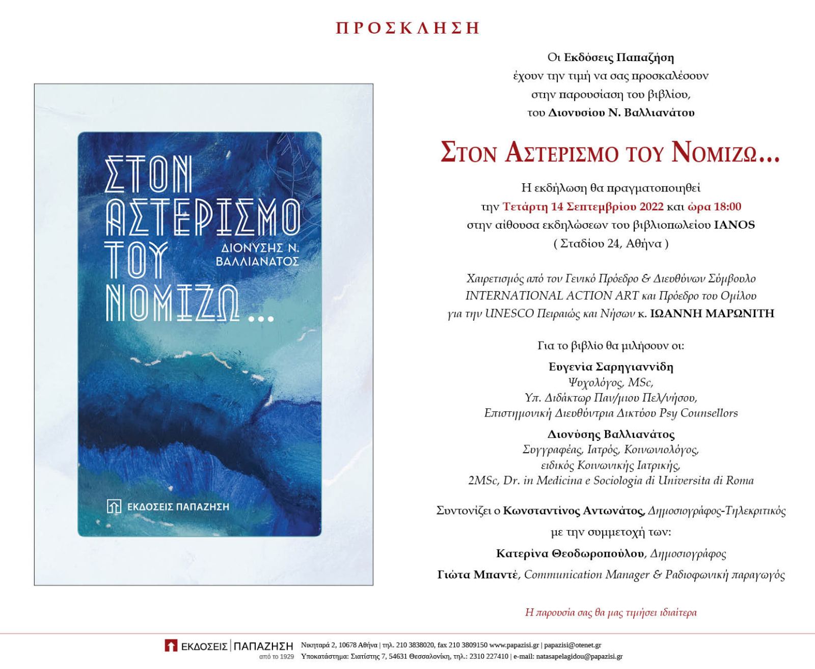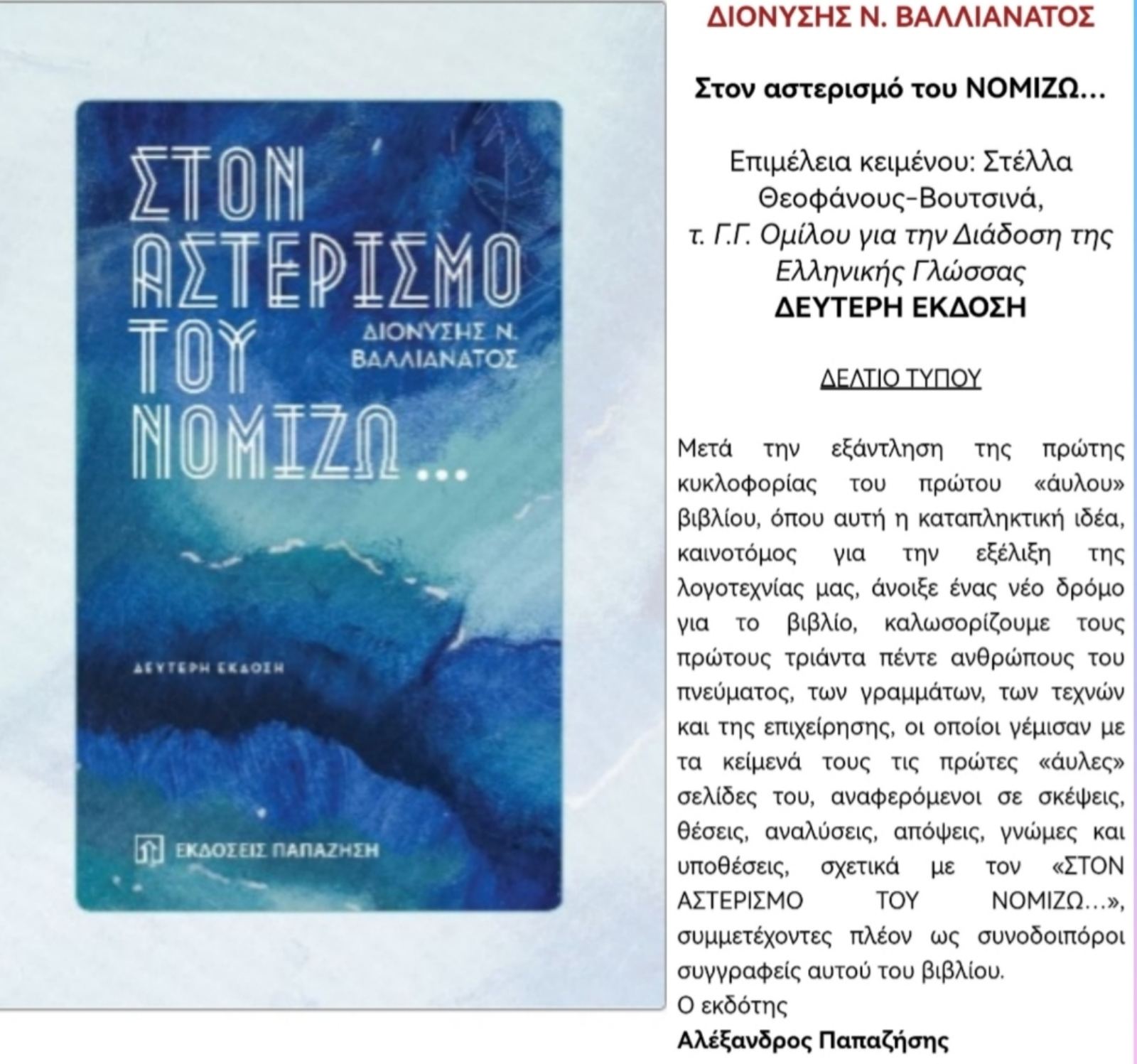 Στον Αστερισμο του ΝΟΜΙΖΩ…. 12 Σεπτεμβρίου 2022 ΑΣ ΑΚΟΥΣΟΥΜΕ ΤΙ ΕΙΠΕ ΣΤΗΝ ΕΚΠΟΜΠΗ ΜΟΥ ΣΤΟ ΝΗΣΙ 93,9 fm Ο ΣΥΓΓΡΑΦΕΑΣ ΙΑΤΡΟΣ κ ΒΑΛΛΙΑΝΑΤΟΣ ΔΙΟΝΥΣΙΟΣ Tweet Share Pin It Share Ακολουθήστε το voutospress.gr στο Google News και μάθετε πρώτοι όλες τις ειδήσεις ΤΟ ΒΗΜΑ ΤΟΥ Δρ ΒΑΛΛΙΑΝΑΤΟΥ ΔΙΟΝΥΣΙΟΥ Διονύσιος Βούτος Δημοσιογράφος 45 χρόνια στην δημοσιογραφία. Δημοσιογράφος ΕΡΤ Σχετικά Άρθρα Δ. ΛΥΚΟΥΔΗΣ: “Η ΚΕΦΑΛΟΝΙΑ ΘΑ ΠΑΕΙ ΜΠΡΟΣΤΑ… ...ΔΕΝ ΞΑΝΑΓΥΡΙΖΟΥΜΕ ΣΤΟ ΠΑΡΕΛΘΟΝ” “H Κεφαλονιά θα πάει μπροστά. Δεν πρόκειται να ξαναγυρίσουμε στο παρελθόν… Πατέρας 4 παιδιών ο οδηγός απορριμματοφόρου που σκοτώθηκε Ένα εργατικό ατύχημα έχει σημαδέψει σήμερα την ειδησεογραφία και αφορά στον θάνατο ενός 53χρονου άνδρα,… ΜΕ ΦΟΝΤΟ ΤΗΝ ΕΠΙΣΚΕΨΗ ΤΟΥ ΥΦΥΠΟΥΡΓΟΥ ΤΡΙΑΝΤΟΠΟΥΛΟΥ ΣΤΗΝ ΙΘΑΚΗ ΓΙΑ ΤΟΝ ΕΟΡΤΑΣΜΟ ΤΗΣ 21ΗΣ ΜΑΗ Για διήμερη επίσκεψη έρχεται στην Ιθάκη ο…