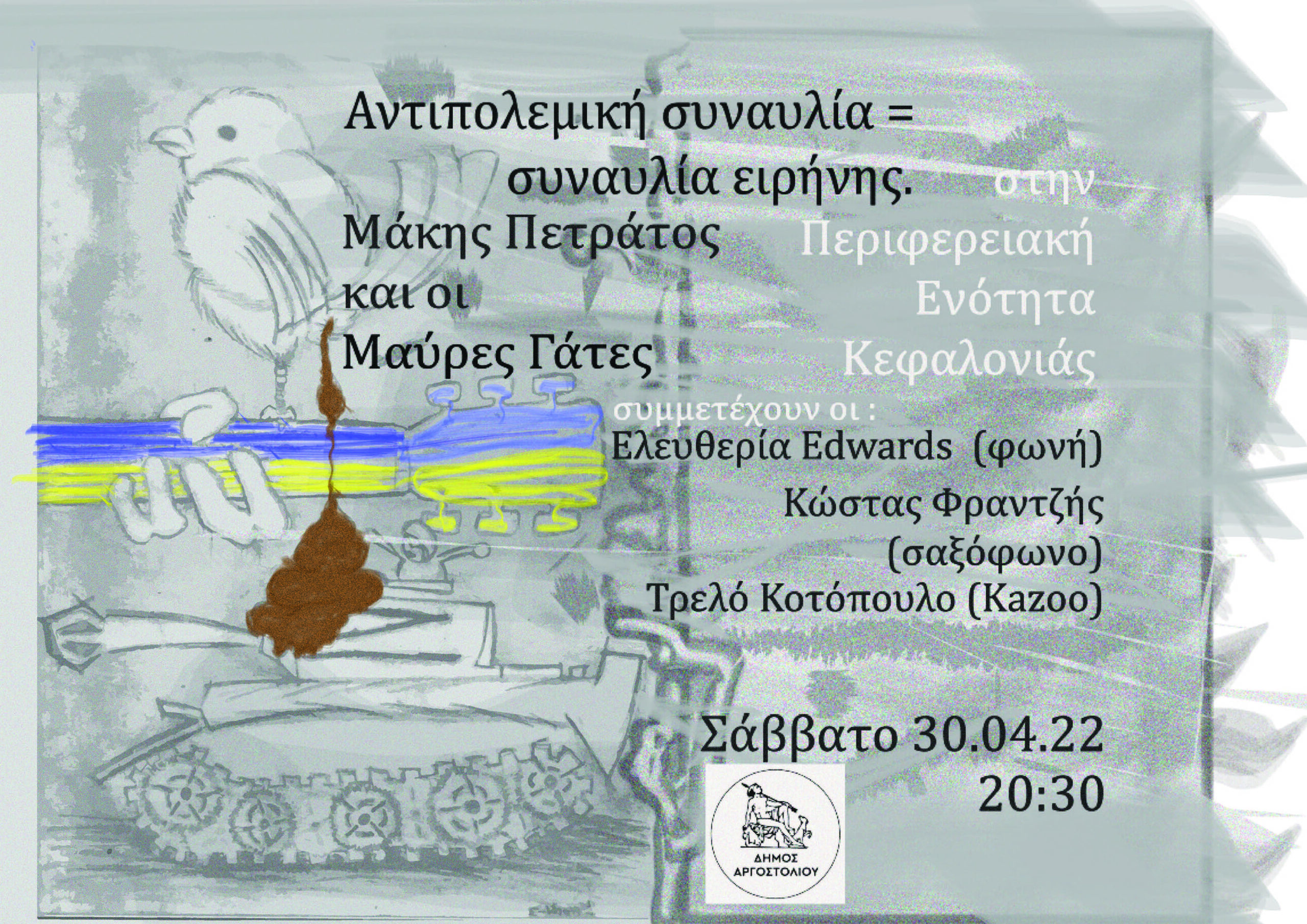 Ο Δήμος Αργοστολίου διοργανώνει μεγάλη συναυλία για την Ειρήνη, μπροστά από την Περιφερειακή Ενότητα Κεφαλονιάς, το Σάββατο 30 Απριλίου στις 20:30 με τη συμμετοχή των ντόπιων καλλιτεχνών: Μάκης Πετράτος & οι Μαύρες Γάτες, Ελευθερία Έντουαρντς (φωνή), Κώστας Φραντζής (σαξόφωνο), Τρελό κοτόπουλο (kazoo).