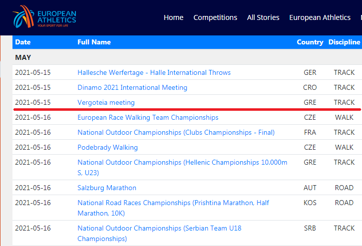 Τα ΒΕΡΓΩΤΕΙΑ 2021 στο επίσημο αγωνιστικό πρόγραμμα της Ευρωπαϊκής Ομοσπονδίας Στίβου.