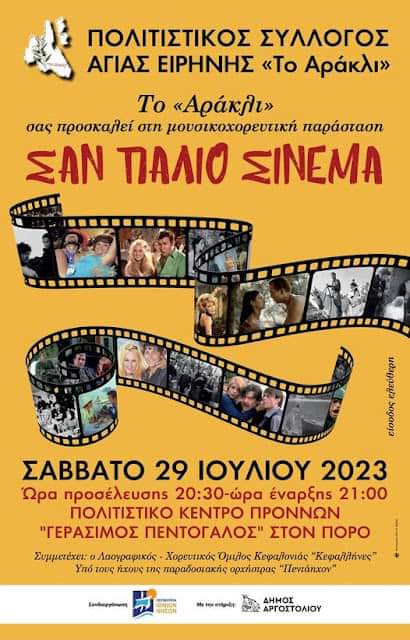 Το αδιαχώρητο έγινε το Σαββατόβραδο στο αμφιθέατρο του Κοινοτικού Καταστήματος του Πόρου Κεφαλονιάς, από θεατές που βρέθηκαν για να παρακολουθήσουν την πραγματικά φανταστική μουσικοχορευτική παράσταση “Σαν Παλιό Σινεμά” από τον Πολιτιστικό Σύλλογο Αγίας Ειρήνης “Το Αράκλι!”
