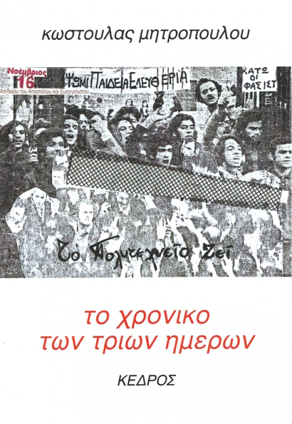 ● Κωστούλα Μητροπούλου, Το χρονικό των τριών ημερών, εκδ. Κέδρος, Αθήνα 1982 (πρώτη έκδοση 1974). Πρόκειται για μυθοπλαστικό έργο, με το οποίο η συγγραφέας προσπαθεί να αποτυπώσει στο χαρτί τα γεγονότα της τριήμερης κατάληψης του Πολυτεχνείου με ζωντάνια αλλά και με οργή και θυμό, με πίστη και ελπίδα.