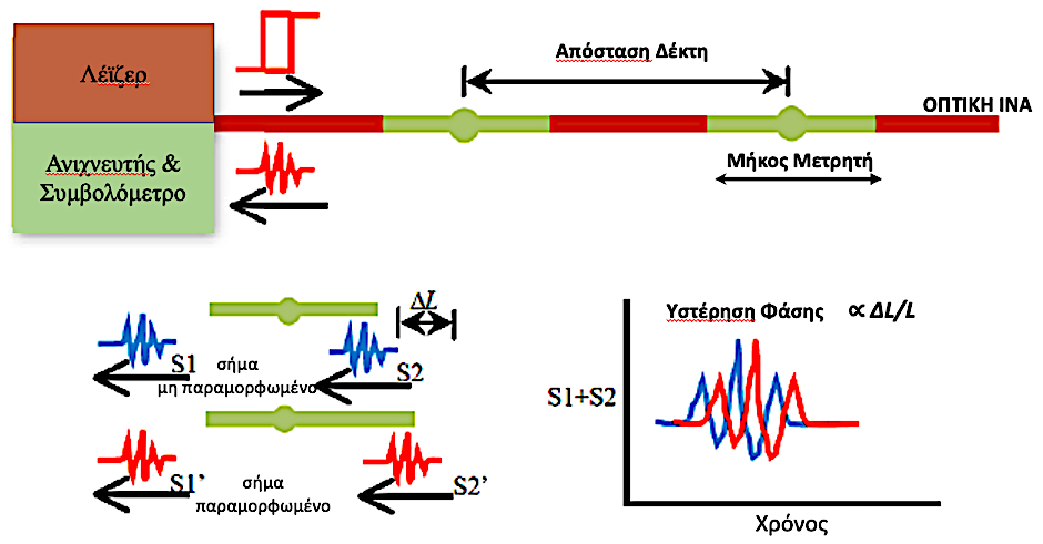 Σχήμα 4. Αρχή λειτουργίας του συστήματος μέτρησης εδαφικής παραμόρφωσης με οπτική ίνα (DAS): [S1+S2] σημαίνει το άθροισμα των σημάτων οπισθοσκέδασης στην αρχή και στο τέλος του μετρητή (χωρίς παραμόρφωση) για την πρώτη εκπομπή παλμού φωτός. [S1’+S2′] σημαίνει το άθροισμα των σημάτων οπισθοσκέδασης στο στην αρχή και στο τέλος του μετρητή μετρητή (παραμορφωμένο) για τη δεύτερη εκπομπή παλμού φωτός. Με ανάλυση της υστέρησης φάσης μεταξύ [S1+S2] και [S1’+S2’], μπορεί να υπολογισθεί η παραμόρφωση κατά μήκος της οπτικής ίνας (τροποποιημένο από τους Li et al. 2015).
