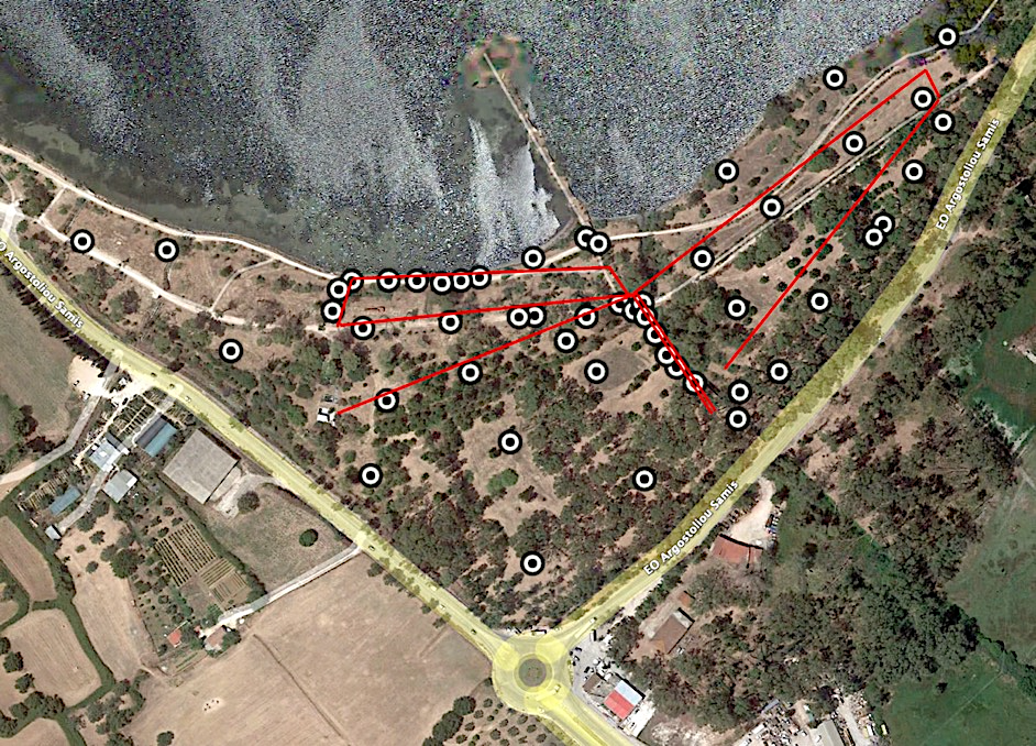 Σχήμα 5. Ανάπτυξη πειραματικής οπτικής ίνας, ~1.5 χιλιόμετρο (κόκκινη γραμμή) και ταυτόχρονη εγκατάσταση πλέον των 50 σεισμογράφων (λευκοί κύκλοι) μέσα στο πάρκο του Κουτάβου, Αργοστολίου.