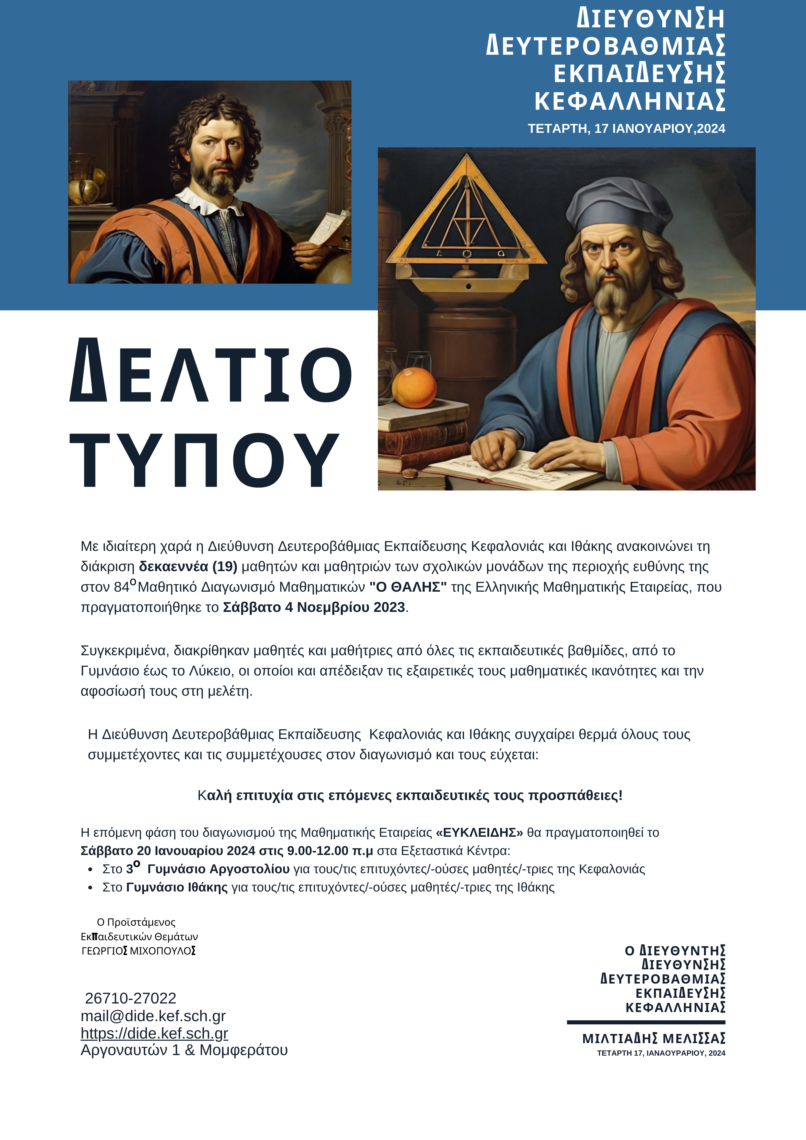 2ΒΑΘΜΙΑ ΠΡΟΙΣΤΑΜΕΝΟΣ ΜΕΛΙΣΣΑΣ ΜΙΛΤΙΑΔΗΣ Κεφαλληνίας 17 Ιανουαρίου 2024 Tweet Share Pin It Share Ακολουθήστε το voutospress.gr στο Google News και μάθετε πρώτοι όλες τις ειδήσεις ΤΟ ΒΗΜΑ ΤΗΣ 2ΒΑΘΜΙΑΣ ΕΚΠΑΙΔΕΥΣΗΣ Διονύσιος Βούτος Δημοσιογράφος 45 χρόνια στην δημοσιογραφία. Δημοσιογράφος ΕΡΤ Σχετικά Άρθρα Ε.Α.Σ. : Πρόστιμα έως 12.000€ στους κτηνοτρόφους που προκαλούν αγροτικές φθορές Ο Ε.Α.Σ. (Αγροτική Ένωση) Κεφαλληνίας & Ιθάκης ενημερώνει ότι ακριβά διοικητικά πρόστιμα έως και 12.000€… ΕΓΚΑΙΝΙΑ ΤΗΣ ΕΚΘΕΣΗΣ “ΠΡΟΣΩΠΟΓΡΑΦΙΕΣ, PERFORMANCE ΚΑΙ ΑΦΙΕΡΩΣΕΙΣ ΣΤΟΝ ΚΩΣΤΑ ΕΥΑΓΓΕΛΑΤΟ” ΣΤΟ ΑΡΓΟΣΤΟΛΙ Συνεχίζονται με επιτυχία τα θερινά εικαστικά δρώμενα στη Σύγχρονη Πινακοθήκη Villa Ροδόπη στο Αργοστόλι της… Γιορτάστηκε η ημέρα Εθνική Αντίστασης στο Αργοστόλι [εικόνες] Σε κλίμα συγκίνησης και παρά το τσουχτερό κρύο πραγματοποιήθηκαν οι εκδηλώσεις τιμής των αγωνιστών της…
