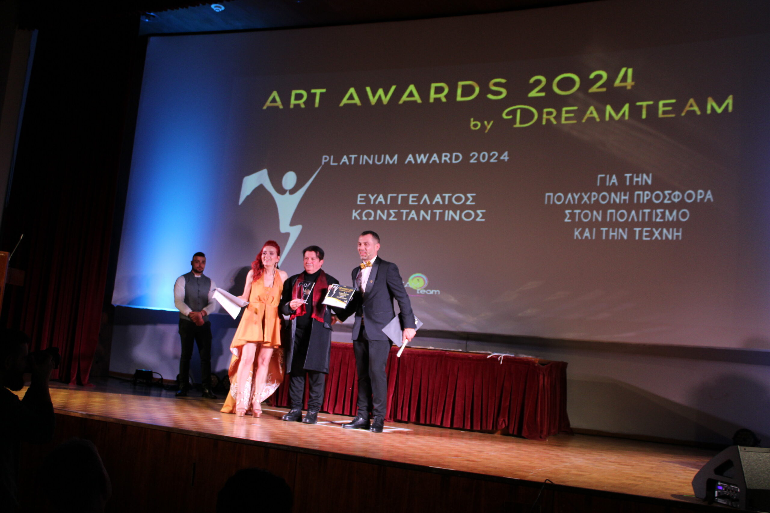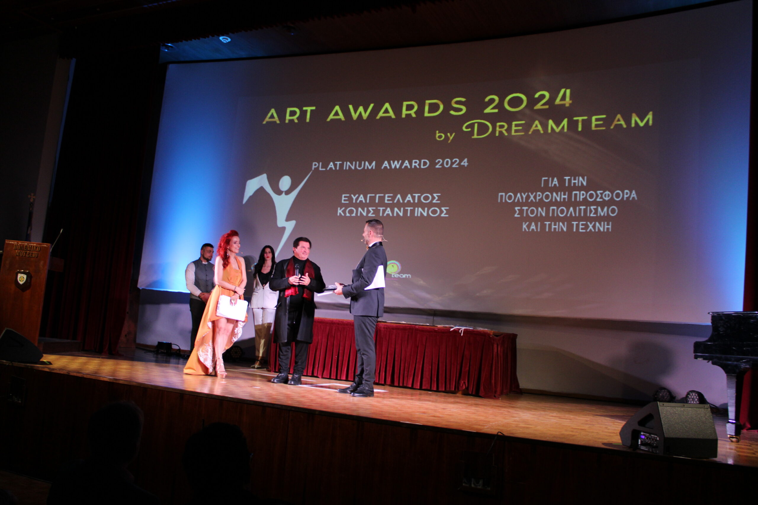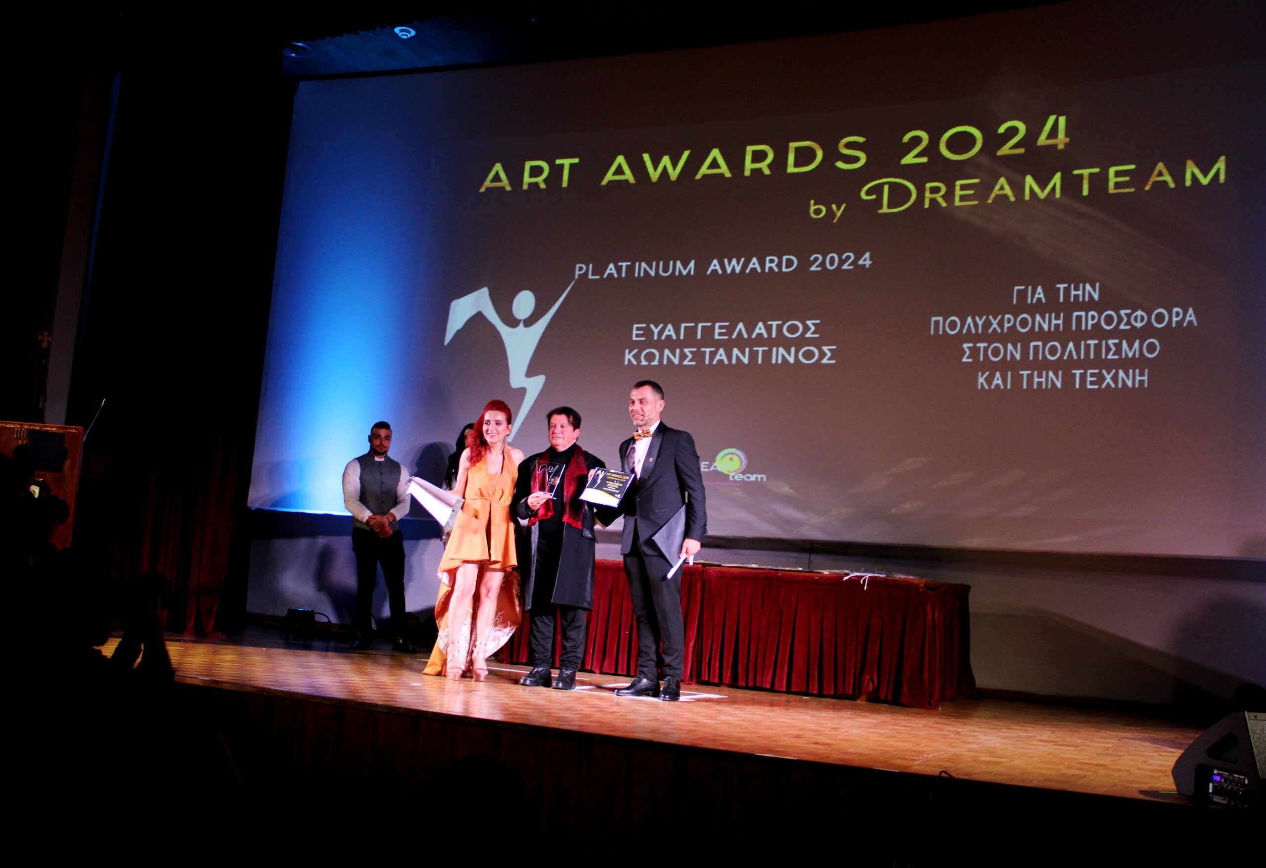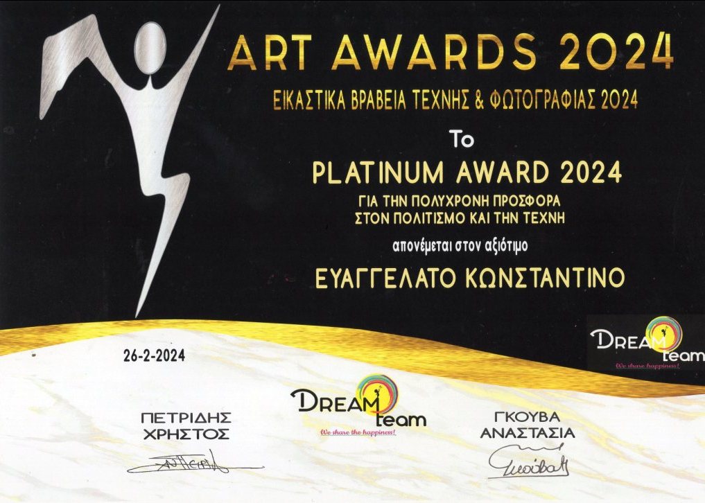 Ο ζωγράφος, λογοτέχνης, θεωρητικός της τέχνης Κώστας Ευαγγελάτος βραβεύθηκε με το “Platinum Award 2024” στο Αμφιθέατρο του Πολεμiκού Μουσείου Αθηνών για το σύνολο της πολύχρονης προσφοράς του στον Πολιτισμό και την Τέχνη. Η βράβευση του έγινε από τoν πρόεδρο κ. Χρήστο Πετρίδη και την αντιπρόεδρο κ. Αναστασία Γκούβα του πολιτιστικού φορέα Dreamteam και του πρωτοπόρου Project Love4art. Η τιμητική διάκριση έγινε στις 26 Φεβρουαρίου 2024, στα πλαίσια της μεγάλης εκδήλωσης των ART AWARDS 2024, τον Πανελλήνιο Διαγωνισμό Τεχνών, υπό την αιγίδα του Υπουργείου Πολιτισμού, του Δήμου Αθηναίων, του Ομίλου για την Unesco Πειραιώς και Νήσων και της International Action Art, που διοργανώθηκε για δεύτερη χρονιά με επιτυχία.