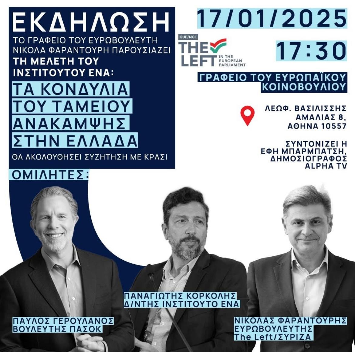 Ομιλητές θα είναι ο Πούλος Γερουλάνος, Βουλευτής Α’ Αθηνών και Τομεάρχης Οικονομίας (Ταμείο Ανάκαμψης) ΠΑΣΟΚ, ο Παναγιώτης Κορκολής, Διευθυντής του Ινστιτούτου ΕΝΑ και ο Καθηγητής Νικόλας Φαραντούρης, Ευρωβουλευτής ΣΥΡΙΖΑ / the Left και Μέλος της Επιτροπής Προϋπολογισμού του Ευρωπαϊκού Κοινοβουλίου.
