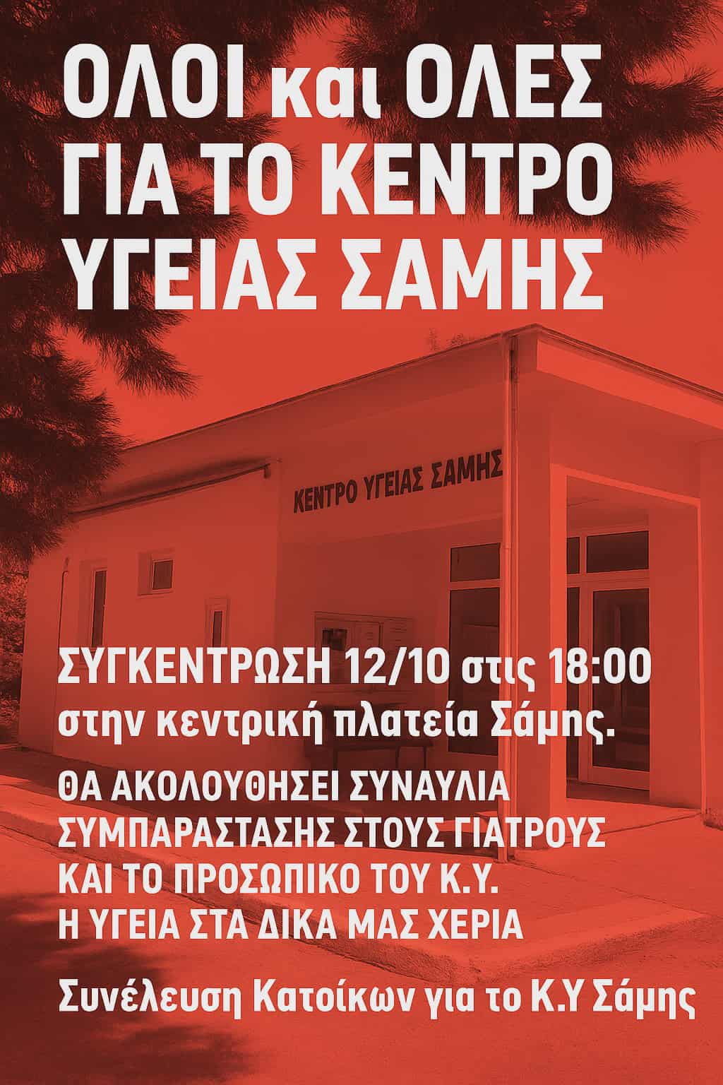 Σε συνέχεια των κινητοποιήσεων που ξεκίνησαν στις 19/9/2025, για τη πλήρη στελέχωση και σωστή λειτουργία του Κ.Υ. Σάμης, η ΠΡΩΤΟΒΟΥΛΙΑ ΠΟΛΙΤΩΝ ΔΗΜΟΥ ΣΑΜΗΣ ΓΙΑ ΤΗ ΣΤΗΡΙΞΗ ΤΟΥ Κ.Υ., καλεί όλους τους δημότες Σάμης, στη συγκέντρωση που διοργανώνει για τη στήριξη του Κ. Υ. τη Κυριακή 12/10/2025 και ώρα 18.00, στη κεντρική πλατεία της Σάμης, για να απαιτήσουμε τη πλήρη στελέχωση και ομαλή λειτουργία του Κ. Υ.