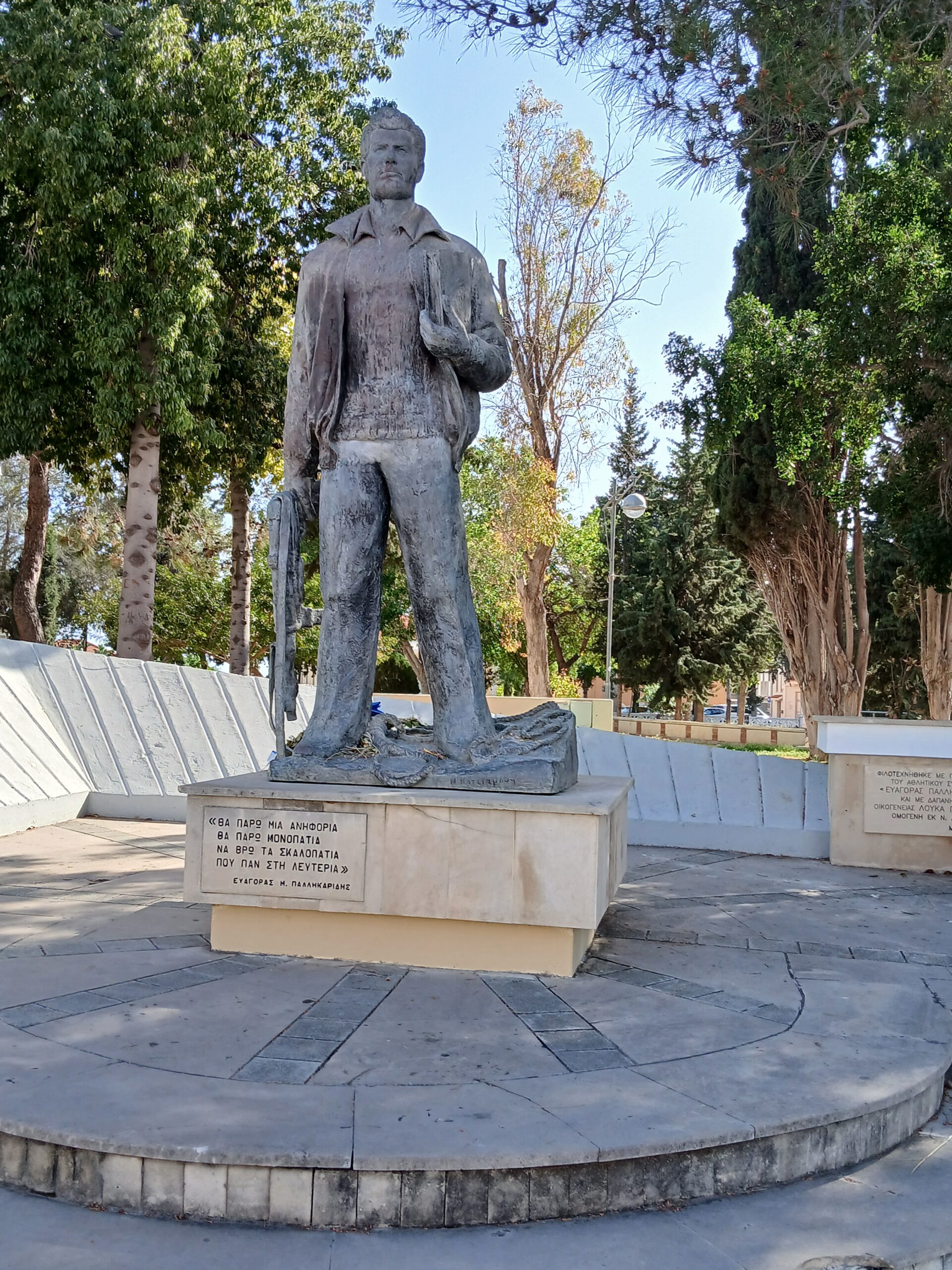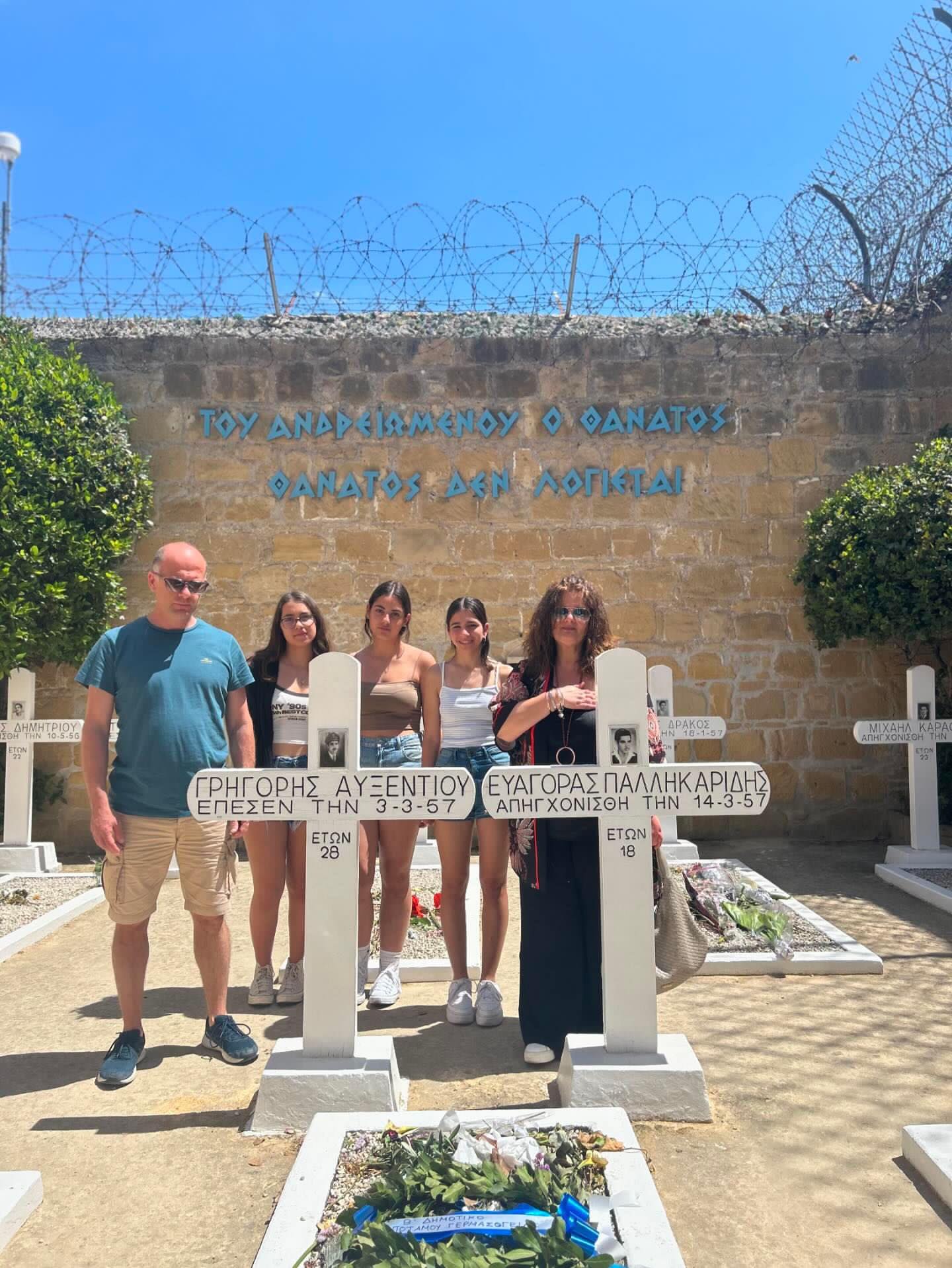 Στην Πάφο γνωρίσαμε τους χώρους στους οποίους φοίτησε και έδρασε ο Ευαγόρας Παλληκαρίδης. Στη Λευκωσία συγκλονιστήκαμε με την ξενάγησή μας στα Φυλακισμένα Μνήματα, στο χώρο των Κεντρικών Φυλακών Λευκωσίας, όπου είναι θαμμένοι 13 ηρωομάρτυρες του εθνικοαπελευθερωτικού αγώνα κατά των Άγγλων και για Ένωση με την Ελλάδα ( 1955-1959). Η αγχόνη, η κουκούλα που αρνήθηκαν οι Ήρωες να βάλουν πριν τον απαγχονισμό τους γιατί δεν φοβούνταν το θάνατο, τα κελιά, τα συρματοπλεγμένα μνήματα ήταν μία ξεχωριστή εμπειρία. Αυτή συνεχίστηκε με την ξενάγησή μας στο Μουσείο Αγώνα, όπου εκτίθενται πολύτιμα τεκμήρια της πάλης του ελληνοκυπριακού λαού για ανεξαρτησία και Ένωση με την προγονική μήτρα, την Ελλάδα. Ο επόμενος Ιερός χώρος που επισκεφθήκαμε ήταν ο τύμβος της Μακεδονίτισσας, όπου οι τάφοι 449 Ελλήνων και Ελληνοκυπρίων που έπεσαν στους αγώνες του 1964 και 1974. Και η συναισθηματική φόρτιση κορυφώθηκε με την επίσκεψή μας στα Κατεχόμενα. Συνειδητοποιήσαμε διά ζώσης τι σημαίνουν οι έννοιες : διχοτόμηση, εποικισμός, ιμπεριαλισμός, μιλιταρισμός… Σε απόσταση λίγων μέτρων βρεθήκαμε σε ένα ψευδοκράτος που ωστόσο επιβάλλεται και παγιώνει την κυριαρχία του απροκάλυπτα και με τη συνενοχή Διεθνών Οργανισμών. Αυτό το “Καλώς ήρθατε στην Τουρκία” μόλις περάσαμε τον έλεγχο των ταυτοτήτων μας, μας πόνεσε πολύ για ευνόητους λόγους…, όπως και ο πληγωμένος Πενταδάκτυλος, όπου η τεράστια σημαία του ψευδοκράτους αναβοσβήνει τα βράδια για να επιβεβαιώνει την επιβολή του Αττίλα.