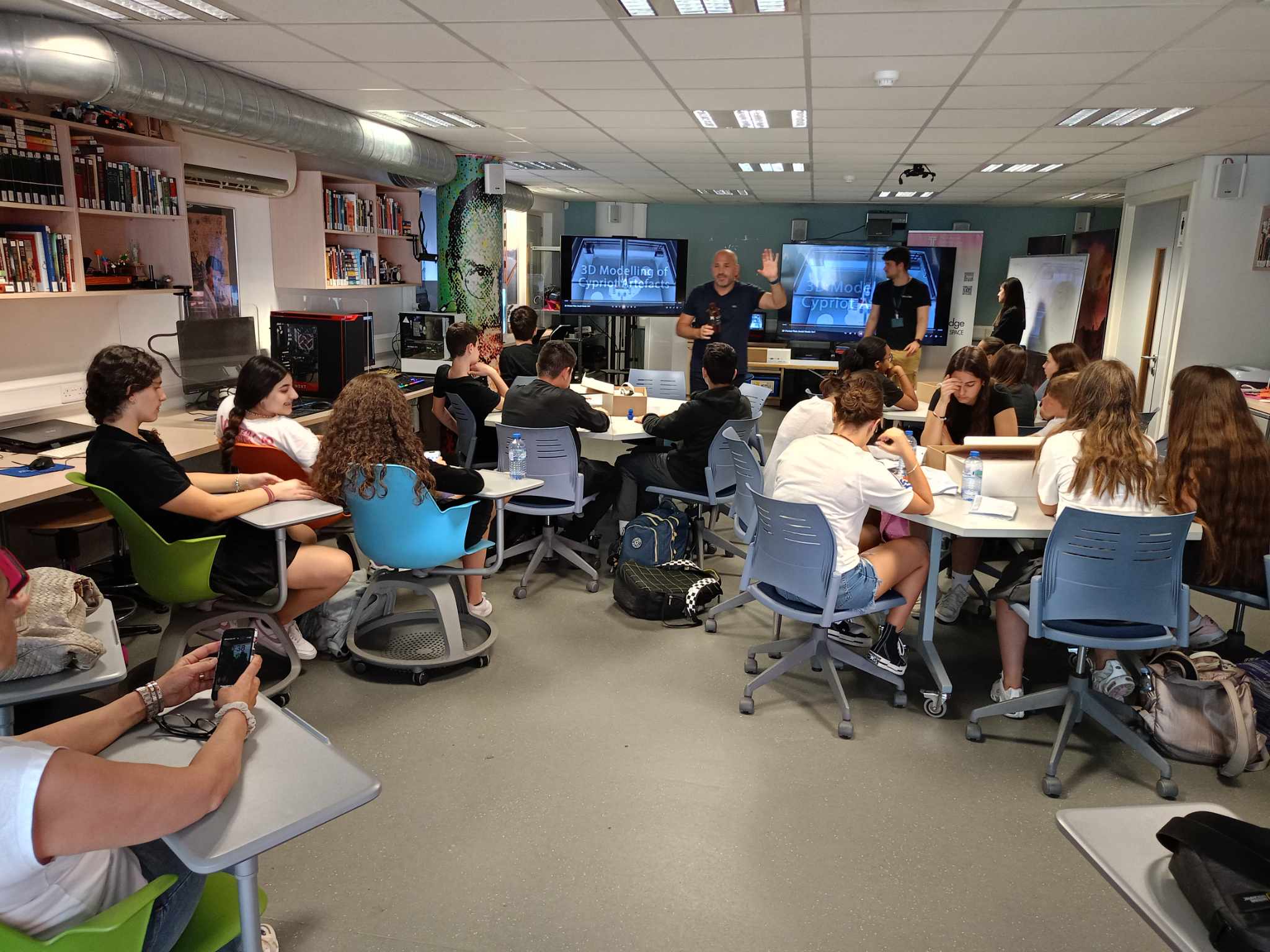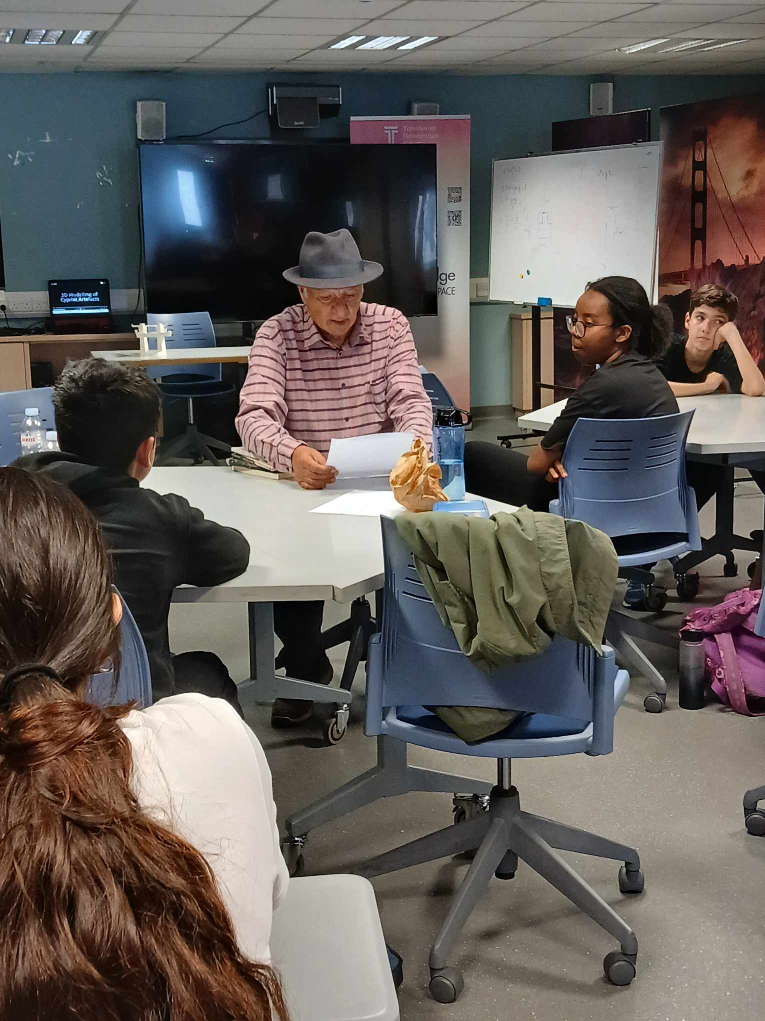 Με έδρα τη Λεμεσό, εφόσον το σχολείο με το οποίο συνεργαστήκαμε ήταν το Θέκλειο Γυμνάσιο Λεμεσού, και χάρη στο πυκνό μας πρόγραμμα, γνωρίσαμε βιωματικά πια όλα εκείνα που είχαμε διαβάσει, ακούσει, δει για το νησί της Αφροδίτης. Καταρχάς, σε αίθουσα του Τεχνολογικού Πανεπιστημίου Κύπρου στη Λεμεσό, προσκαλέσαμε ξανά τον κ. Χαριτωνίδη, ο οποίος απαντώντας σε ερωτήσεις των τριών μαθητριών μας, μοιράστηκε τα βιώματά του, τις σκέψεις του για τον πόλεμο, το ρόλο των ισχυρών, τον ξεριζωμό και την προσφυγιά σε μαθήτριες και μαθητές του Θέκλειου Γυμνασίου, το οποίο σημειωτέον είναι πολυπολιτισμικό.
