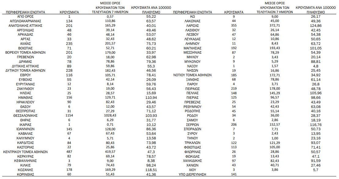 Ο πίνακας του ΕΟΔΥ με τα κρούσματα ανά περιοχή:
