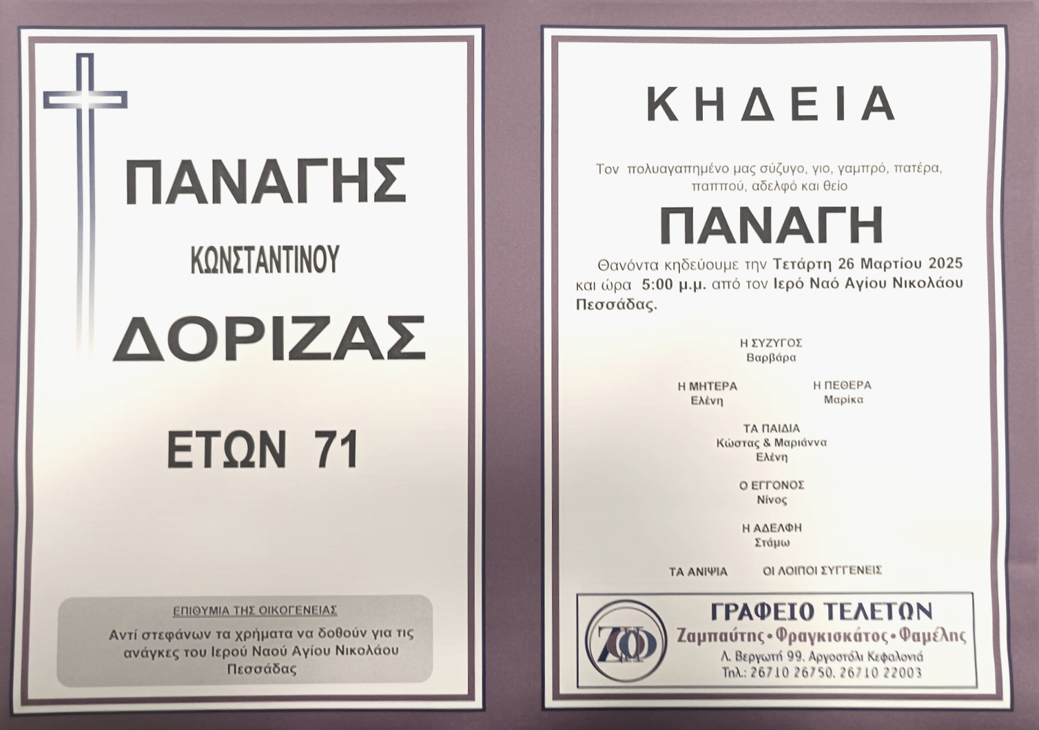 Έφυγε ο Φίλος μου Παναγής Δοριζας καλό σου Ταξίδι Παναγή μου και Θερμά Συλλυπητήρια στην Αγαπημένη μου οικογένειά σου. Η Κηδεία θα Πραγματοποιηθεί Τετάρτη ώρα 5.00 μ.μ στον Άγιο Νικόλαο Πεσσάδας