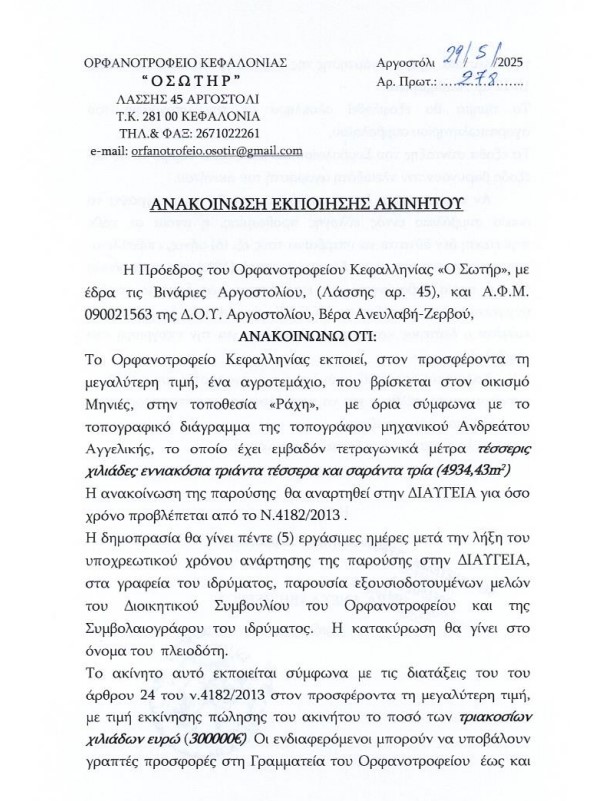 ΑΝΑΚΟΙΝΩΣΗ ΕΚΠΟΙΗΣΗΣ ΑΚΙΝΗΤΟΥ 13 Ιουνίου 2025 το link https://minfin.gov.gr/e-ypiresies/psifiakes-ypiresies-anakoinoseis-koinofelon-periousion/ ΚΑΙ ΤΟ έγγραφο Tweet Share Pin It Share Ακολουθήστε το voutospress.gr στο Google News και μάθετε πρώτοι όλες τις ειδήσεις ΤΟ ΒΗΜΑ ΤΟΥ ΟΡΦΑΝΟΤΡΟΦΕΙΟΥ ΚΕΦΑΛΛΗΝΙΑΣ Διονύσιος Βούτος Δημοσιογράφος 45 χρόνια στην δημοσιογραφία. Δημοσιογράφος ΕΡΤ Σχετικά Άρθρα Ερωτήματα για την επόμενη ημέρα εφόσον αυτονομηθεί το Ποτάμι Πού θα εκβάλει το Ποτάμι; Το ερώτημα αυτό από το βράδυ δεν θα είναι καθόλου… Από την Κρήτη ως την Κέρκυρα… Οι κάτοικοι 17 νησιών μας καλούν στους «παραδείσους» τους! Έχετε αναρωτηθεί ποτέ πόσες δεκάδες και… Δεν συνεργάζονται ΚΙΝΑΛ και Ποτάμι με τον Τσίπρα Γεννηματά και Θεοδωράκης δεν «τσίμπησαν» με την…