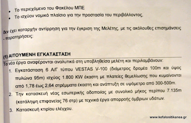 Σύμφωνα με έγγραφα που φέρνουν στη δημοσιότητα τα Κεφαλονίτικα Νέα, στην περιοχή αναμένεται να τοποθετηθούν ανεμογεννήτριες που θα είναι οι μεγαλύτερες που μπήκαν ποτέ στην Κεφαλονιά.