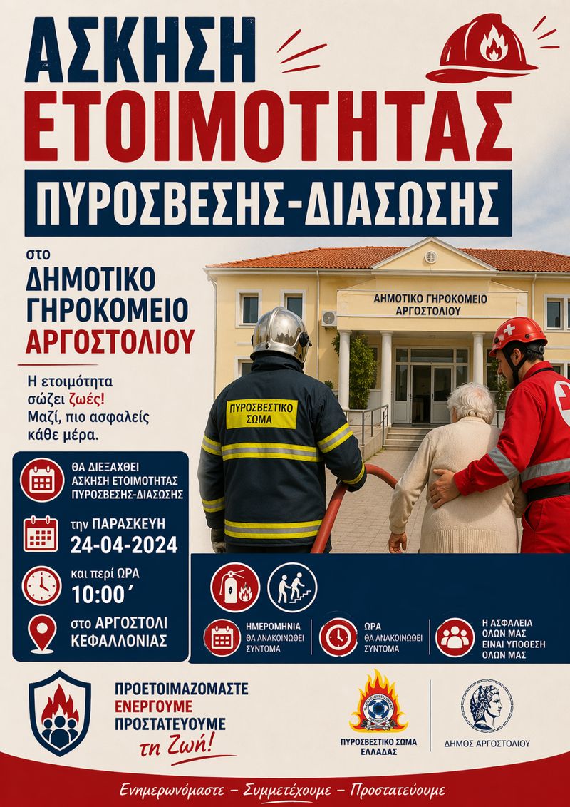 Σας γνωρίζουμε ότι στα πλαίσια της διαρκούς εκπαίδευσης των υπαλλήλων της Υπηρεσίας μας αλλά και της αρτιότερης συνεργασίας μεταξύ των εμπλεκόμενων φορέων, θα διεξαχθεί άσκηση ετοιμότητας πυρόσβεσης-διάσωσης την Παρασκευή 24-04-2024 και περί ΩΡΑ 10:00΄ στο Αργοστόλι Κεφαλλονιάς, με πεδίο άσκησης τις εγκαταστάσεις του Δημοτικού Γηροκομείου Αργοστολίου.