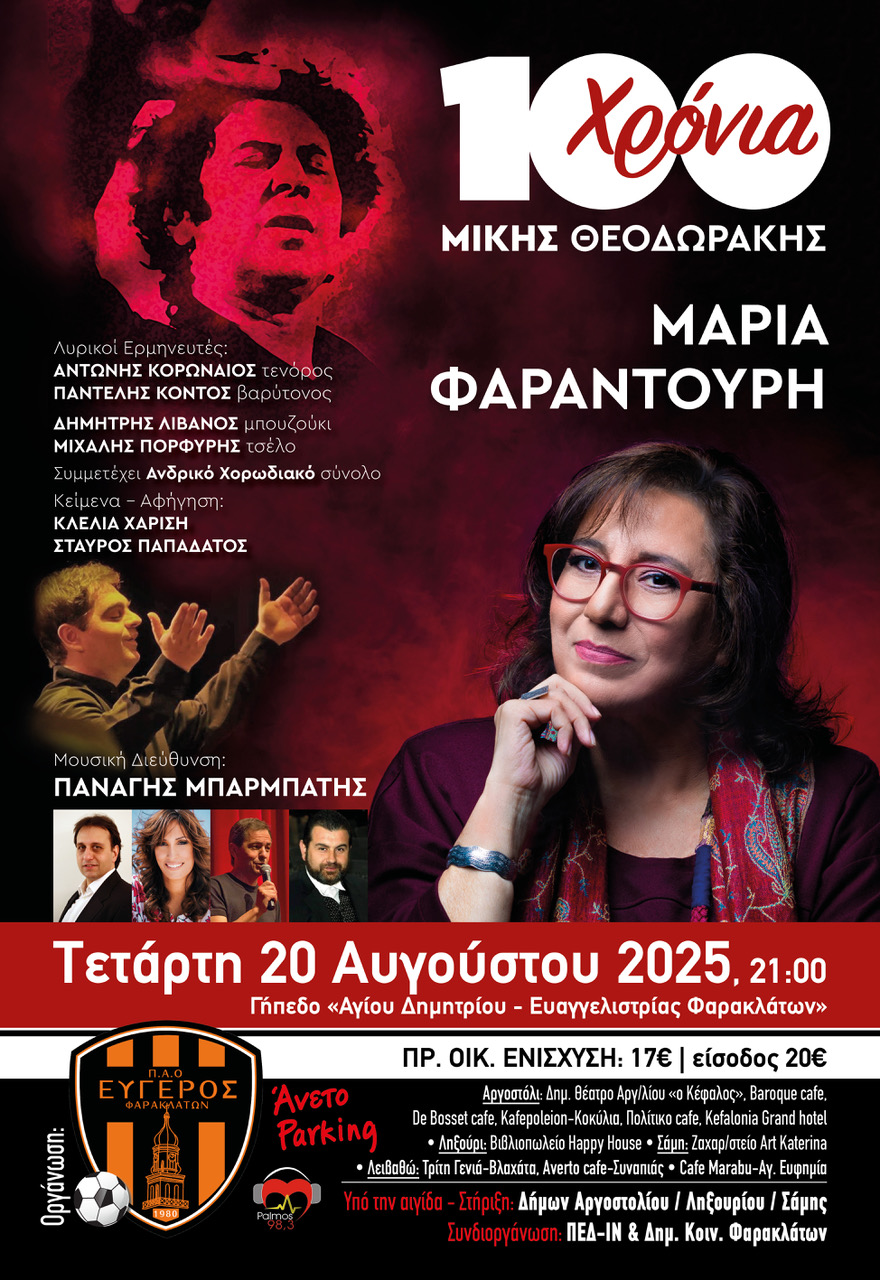Η Μαρία Φαραντούρη, η ιέρεια του Μίκη Θεοδωράκη, έρχεται στην Κεφαλονιά στις 20 Αυγούστου στο Δημοτικό Στάδιο Φαρακλάτων.