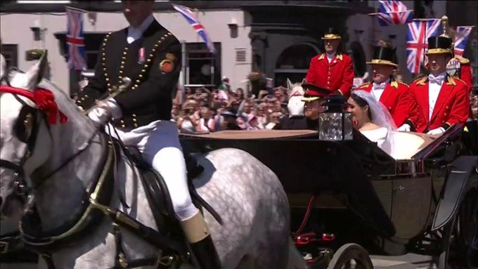 Ακολούθησε η γαμήλια βόλτα με το ζευγάρι να χαιρετάει το πλήθος που χαιρόταν με την ευτυχία τους. Και μάλιστα η Μέγκαν έμοιαζε να μην πιστεύει όσα ζούσε. Η κραυγή γουάου που έβγαλε από το στόμα της συνοδεύτηκε από την φράση του Χάρι «τώρα είμαι έτοιμος για ένα ποτό!»
