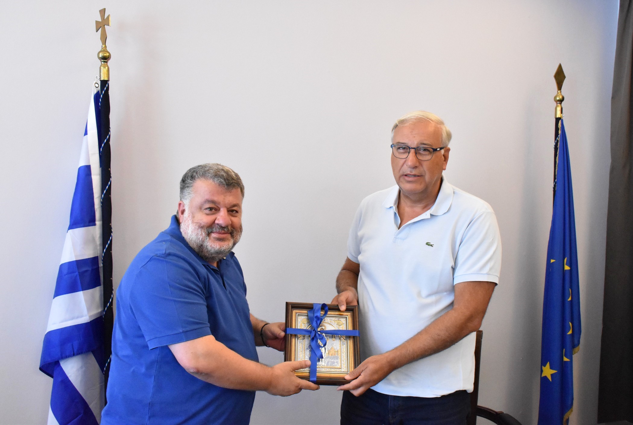 Ο κ. Σταυριανουδάκης, στο τέλος της συνάντησης, παρέλαβε από τον Δήμαρχο Αργοστολίου, αναμνηστικό δώρο με την εικόνα του Αγίου Γερασίμου.