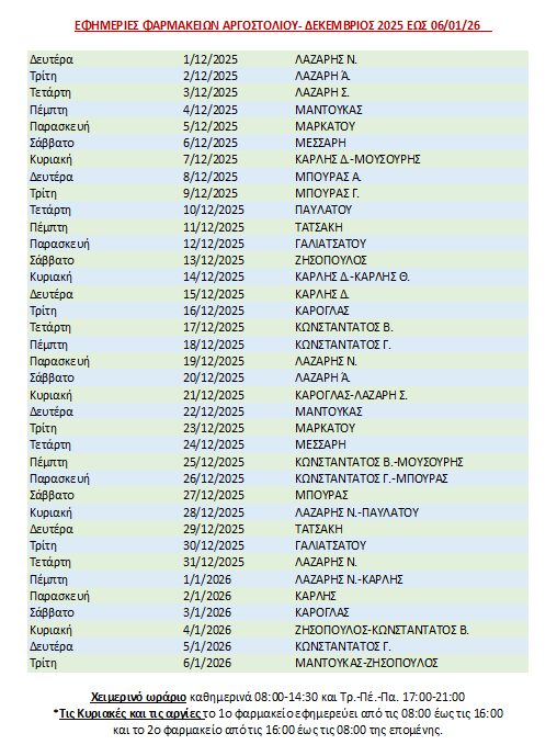 Εφημερίες Φαρμακείων Αργοστολίου Δεκέμβριος 2025 εως 6/01/ 2026 21 Δεκεμβρίου 2025 Tweet Share Pin It Share Ακολουθήστε το voutospress.gr στο Google News και μάθετε πρώτοι όλες τις ειδήσεις ΤΟ ΒΗΜΑ ΤΩΝ ΦΑΡΜΑΚΕΙΩΝ Διονύσιος Βούτος Δημοσιογράφος 45 χρόνια στην δημοσιογραφία. Δημοσιογράφος ΕΡΤ Σχετικά Άρθρα “Χριστός Ανέστη” – Το αναστάσιμο μήνυμα από την πλατεία Αργοστολίου μέσα σε πανδαισία βεγγαλικών! (εικόνες/video) Χριστός Ανέστη! Με υγεία σε όλους και όλες! Το αναστάσιμο μήνυμα έστειλε από την πλατεία… ΠΡΟΣΚΛΗΣΗ ΣΥΜΜΕΤΟΧΗΣ ΕΠΙΧΕΙΡΗΣΕΩΝ ΣΤΟ 3ο ΦΕΣΤΙΒΑΛ ΓΑΣΤΡΟΝΟΜΙΑΣ & ΟΙΝΟΥ ΣΤΟ ΛΗΞΟΥΡΙ 18 & 19 ΙΟΥΛΙΟΥ Διοργάνωση 3ου Φεστιβάλ Γαστρονομίας & Οίνου Μετά από 3 χρόνια απουσίας λόγω υγειονομικών συνθηκών, επανέρχεται… Ναπολέων Μαραβέγιας: Να ενταχθούν τα κινητά τηλέφωνα στα σχολεία! [βίντεο] Πρόταση να ενταχθούν τα κινητά τηλέφωνα στην εκπαιδευτική διαδικασία των σχολείων πρότεινε ο Αντιπρύτανης του…