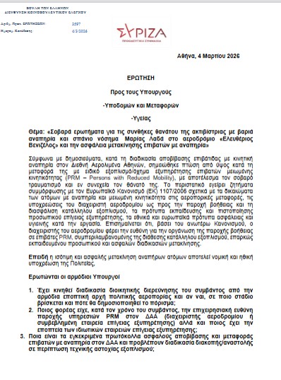 Τα σοβαρά ερωτήματα για τις συνθήκες θανάτου της ακτιβίστριας με βαριά αναπηρία και σπάνιο νόσημα, Μαρίας Λαδά, στο αεροδρόμιο «Ελευθέριος Βενιζέλος» και της ασφάλειας μετακίνησης επιβατών με αναπηρία, έφεραν με Ερώτησή τους στη Βουλή, προς τους Υπουργούς Υποδομών και Μεταφορών και Υγείας, τρεις βουλευτές του ΣΥΡΙΖΑ.
