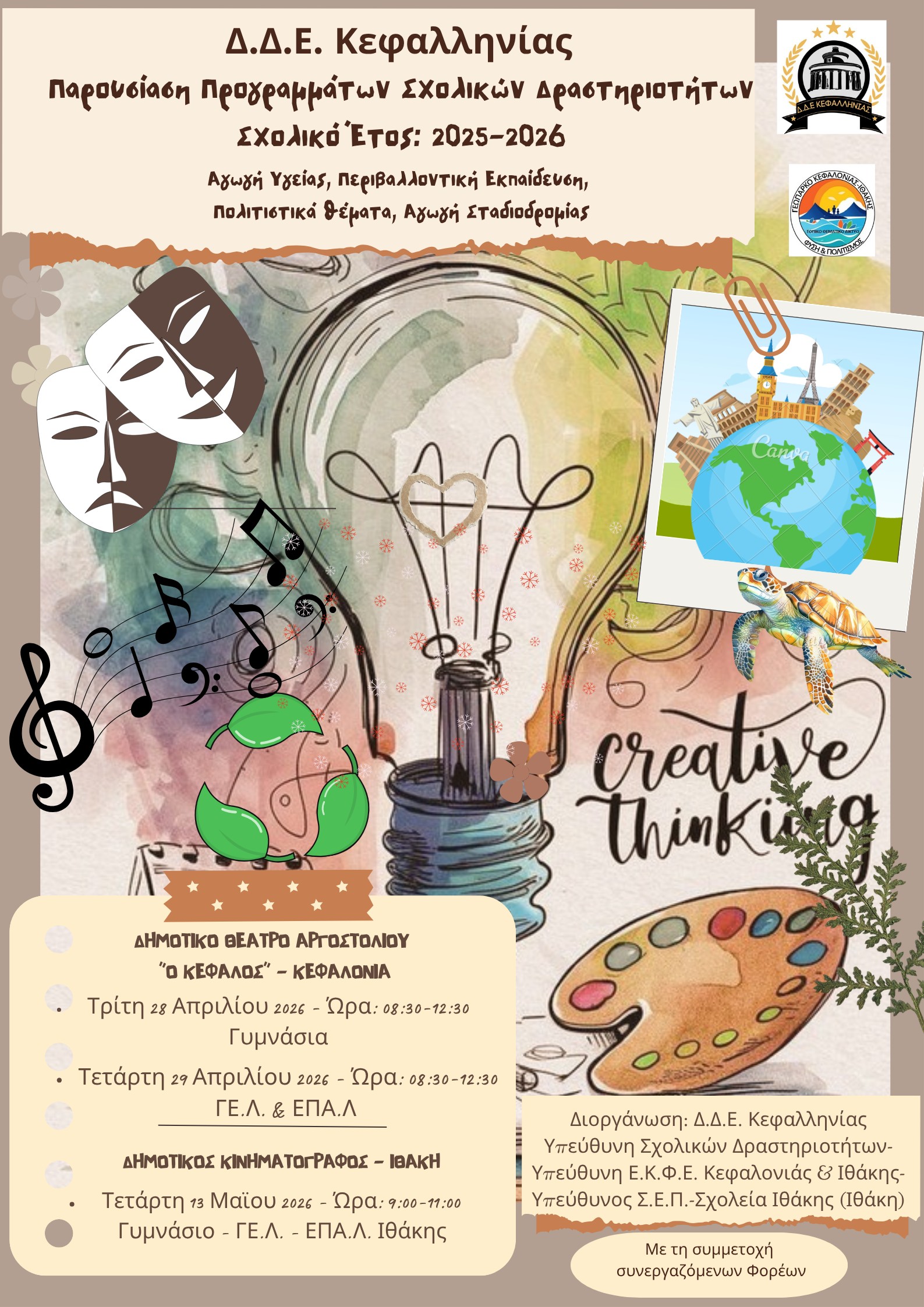 Η Διεύθυνση Δευτεροβάθμιας Εκπαίδευσης Κεφαλληνίας δια της Υπεύθυνης Σχολικών Δραστηριοτήτων σε συνεργασία με την Υπεύθυνη Ε.Κ.Φ.Ε. Κεφαλονιάς & Ιθάκης και τον Υπεύθυνο Σ.Ε.Π. διοργανώνει διήμερη εκδήλωση Παρουσίασης Προγραμμάτων Σχολικών Δραστηριοτήτων (Αγωγής Υγείας, Περιβαλλοντικής Εκπαίδευσης, Πολιτιστικών Θεμάτων και Αγωγής Σταδιοδρομίας), τα οποία υλοποιήθηκαν κατά το σχολικό έτος: 2025-2026, στο Δημοτικό Θέατρο Αργοστολίου «Ο Κέφαλος»