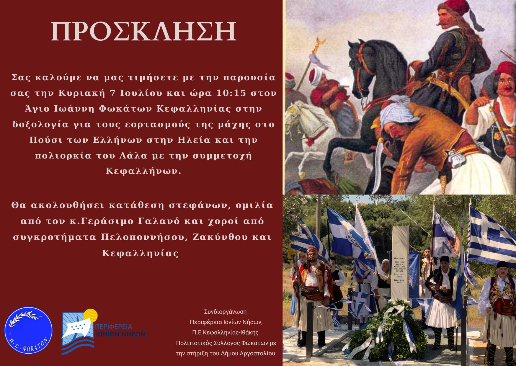 Με κάθε επισημότητα θα εορταστεί για τρίτη φορά στον Άγιο Ιωάννη Φωκάτων η επέτειος της μάχης στο Πούσι Αρχαίας Ολυμπίας εναντίον των Λαλαίων . από τον Πολιτιστικό Σύλλογο ΦΩΚΑΤΩΝ και την Π.Ε. Κεφαλληνίας και Ιθάκης με την στήριξη του Δήμου Αργοστολίου την Κυριακή 7 Ιουλίου .Στην νικηφόρα αυτή μάχη καθοριστική ήταν η συμμετοχή των Κεφαλλήνων, μια μάχη που αναπτέρωσε το ηθικό των Ελλήνων και άνοιξε τον δρόμο για την άλωση της Τριπολιτσας.