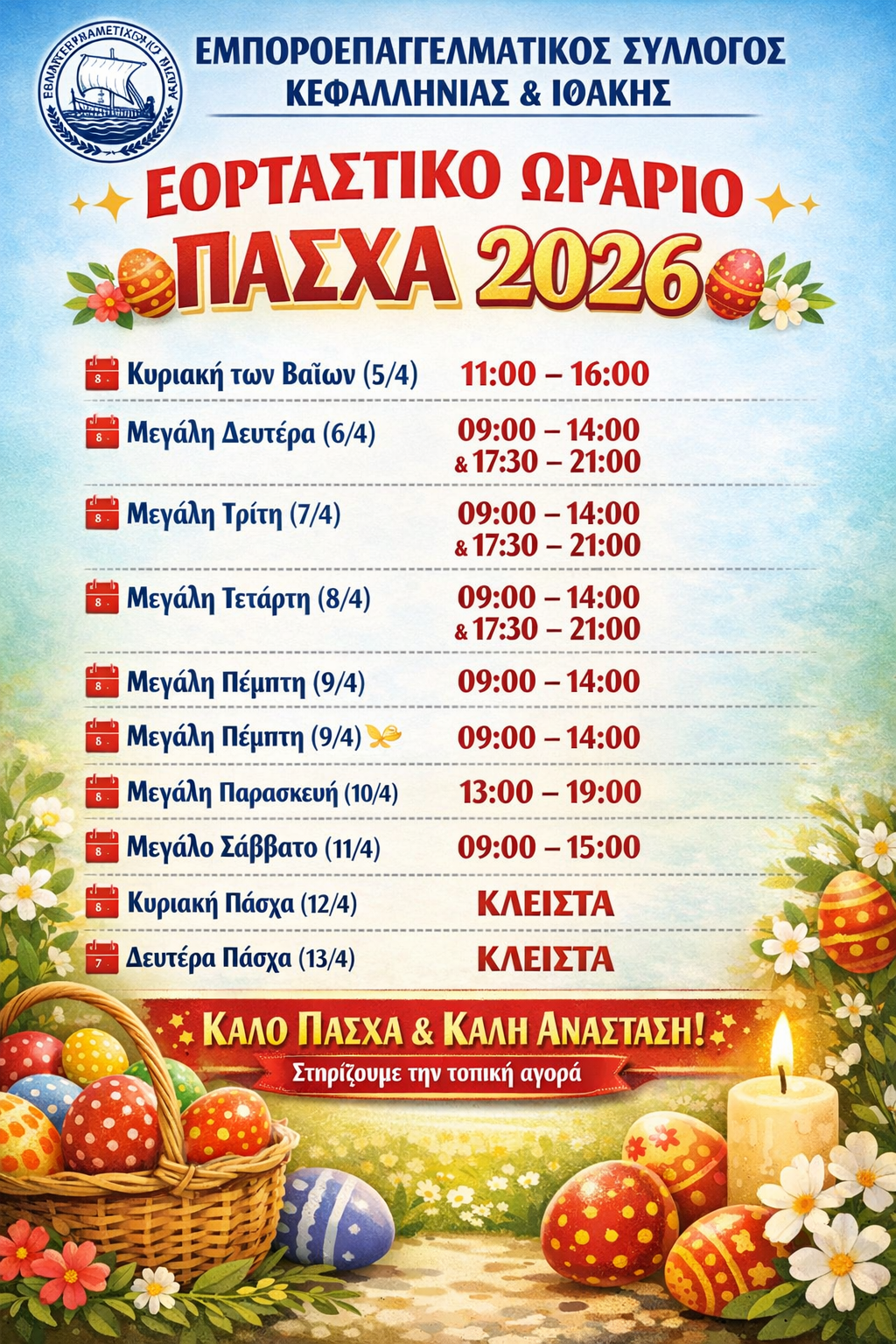 ΕΟΡΤΑΣΤΙΚΟ ΩΡΑΡΙΟ ΕΜΠΟΡΙΚΩΝ ΚΑΤΑΣΤΗΜΑΤΩΝ ΠΑΣΧΑ 2026 (ΠΡΟΤΕΙΝΟΜΕΝΟ)