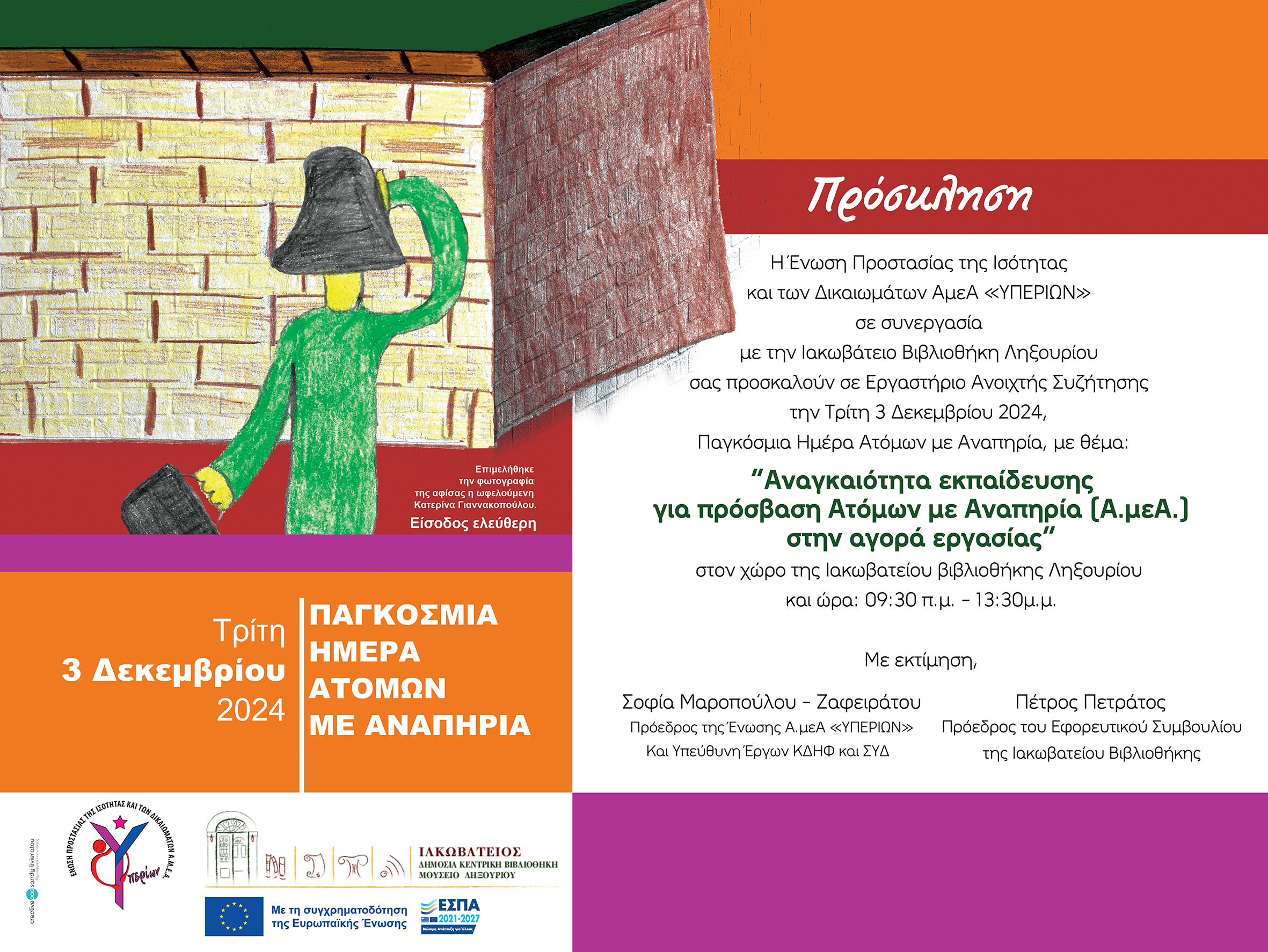 Η Ένωση Προστασίας της Ισότητας και των Δικαιωμάτων ΑμεΑ «ΥΠΕΡΙΩΝ», οι δομές ΚΔΗΦ και ΣΥΔ Α.μεΑ «ΥΠΕΡΙΩΝ» σε συνεργασία με την Ιακωβάτειο βιβλιοθήκη Ληξουρίου διοργανώνουν Εργαστήριο Ανοιχτής Συζήτησης την Τρίτη 3 Δεκεμβρίου 2024, Παγκόσμια Ημέρα Ατόμων με Αναπηρία, με θέμα: «Αναγκαιότητα εκπαίδευσης για πρόσβαση Α.μεΑ. στην αγορά εργασίας»