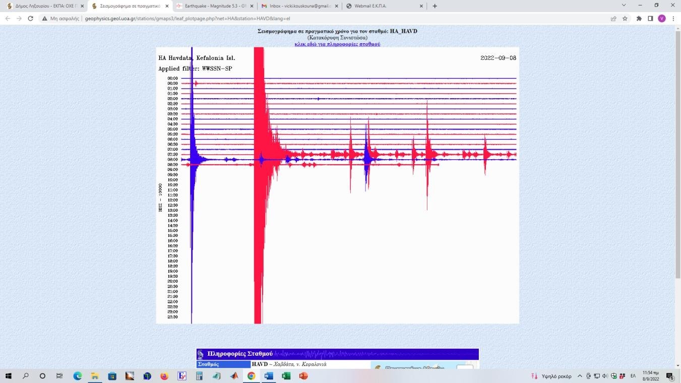 Εικ. 5: Καταγραφή του σεισμού Μ5.3 της 8/9/2022 στην Κεφαλονιά από τον σεισμογράφο στον σταθμό HAVD (Χαβδάτα)