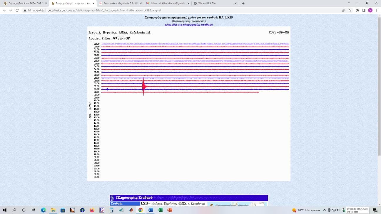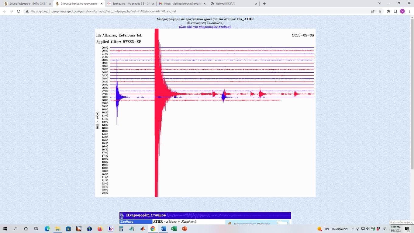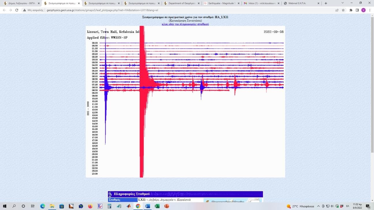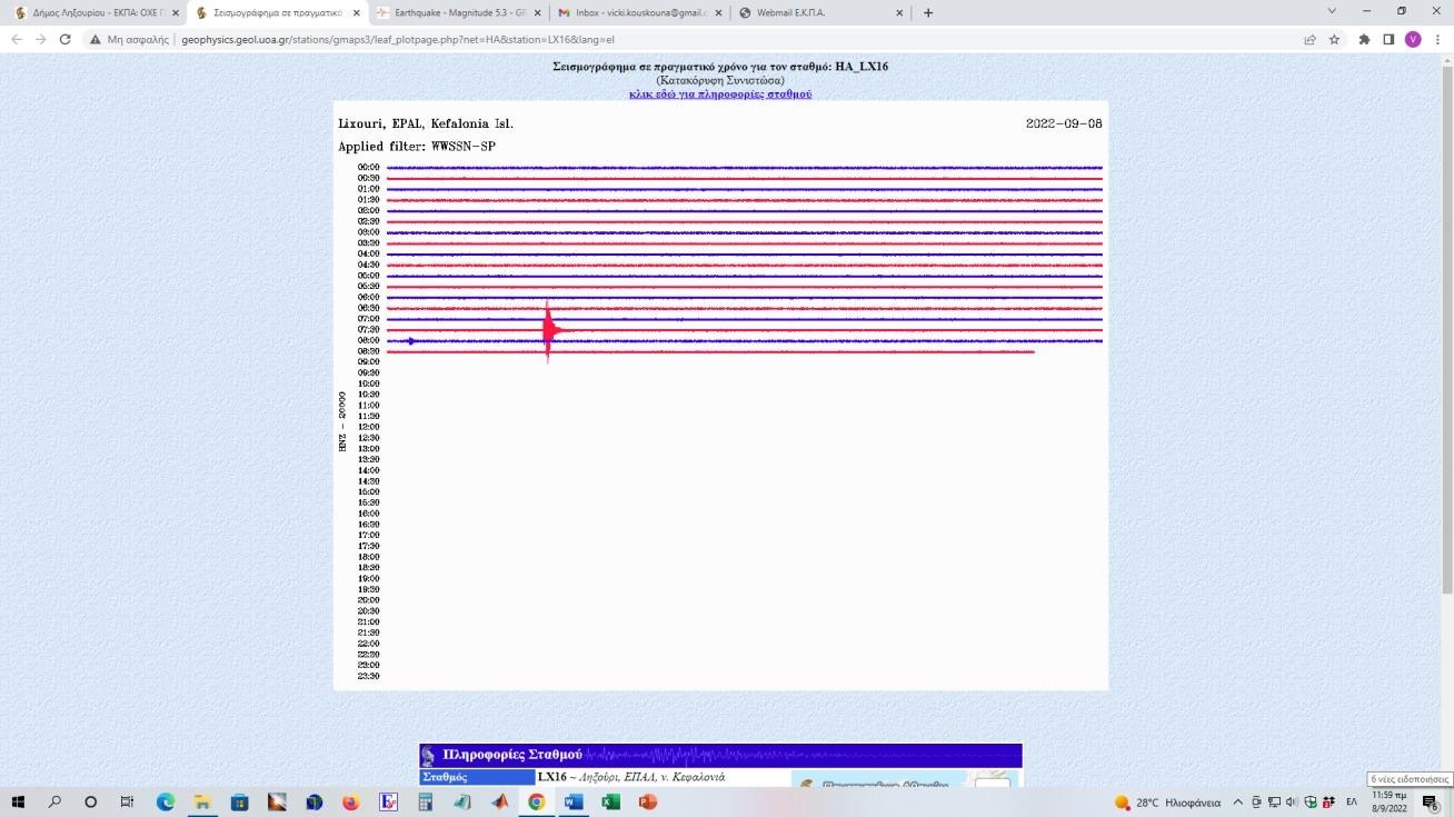 Εικ. 4: Καταγραφή του σεισμού Μ5.3 της 8/9/2022 στην Κεφαλονιά από τον σεισμογράφο στον σταθμό LX11 (Δημαρχείο)