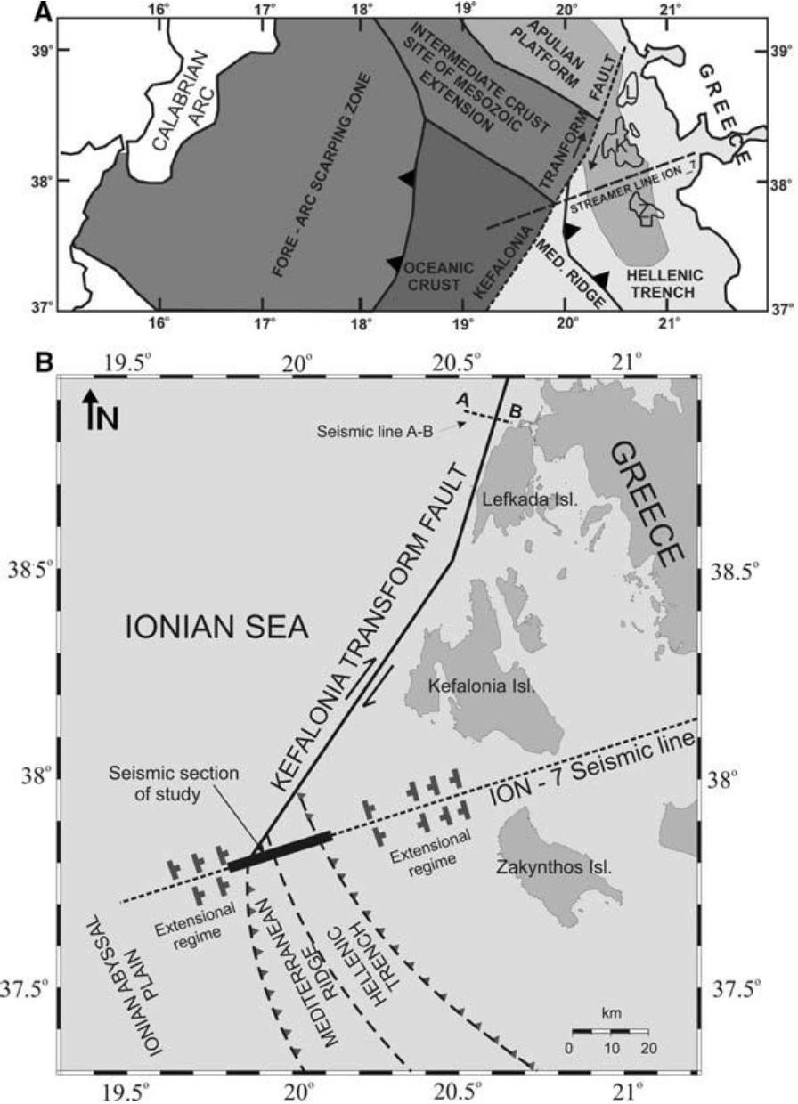 Εικ. 2: Απεικόνιση κύριων ρηξιγενών δομών Α) στην ευρύτερη περιοχή των Ιονίων νήσων και Β) στην περιοχή Κεφαλονιάς – Λευκάδας (Kokkinou et al. 2006).